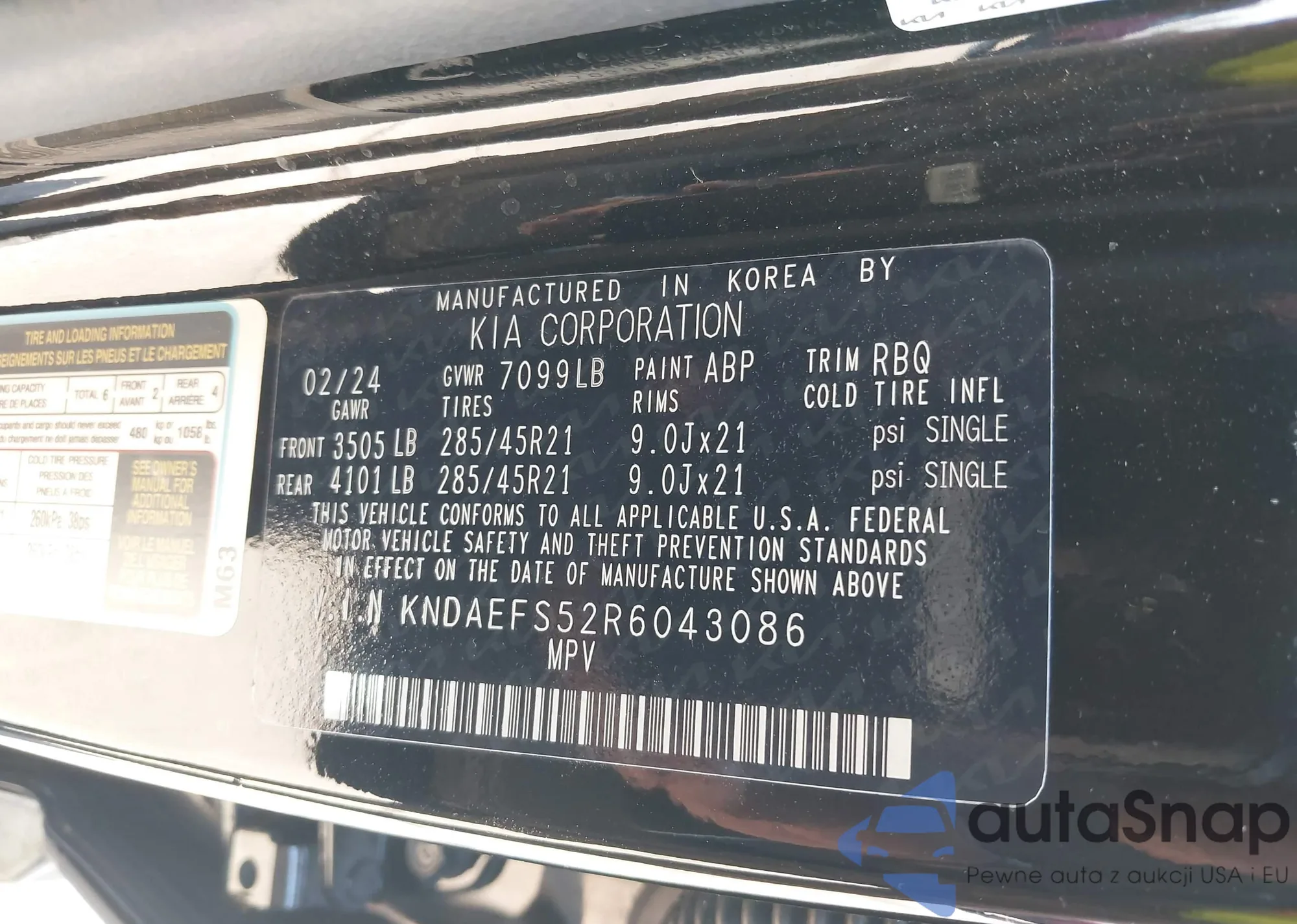 LOT: 43607382 VIN: KNDAEFS52R6043086