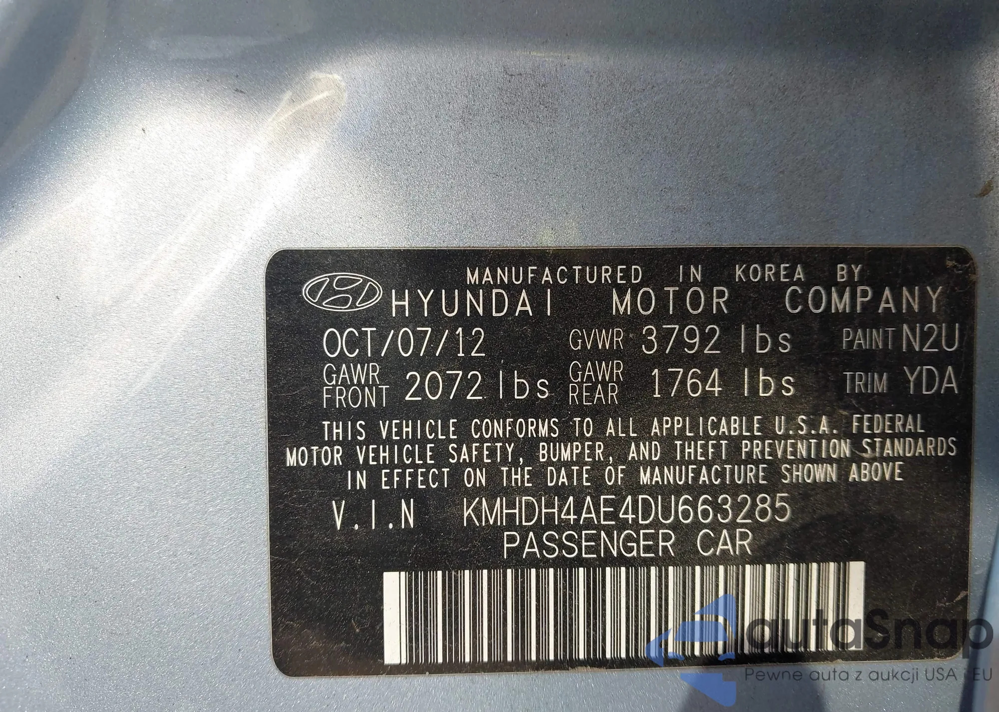 LOT: 43629499 VIN: KMHDH4AE4DU663285