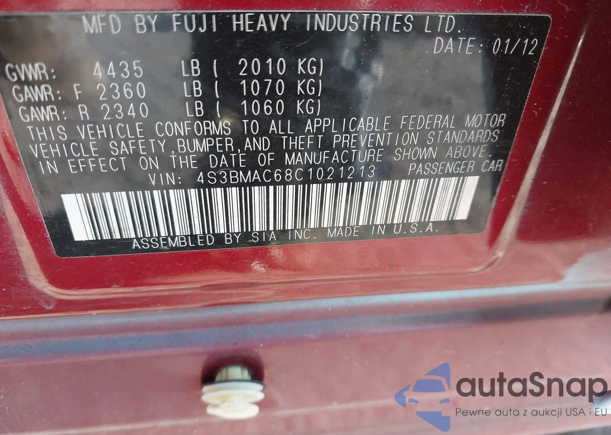 • VIN 4S3BMAC68C1021213