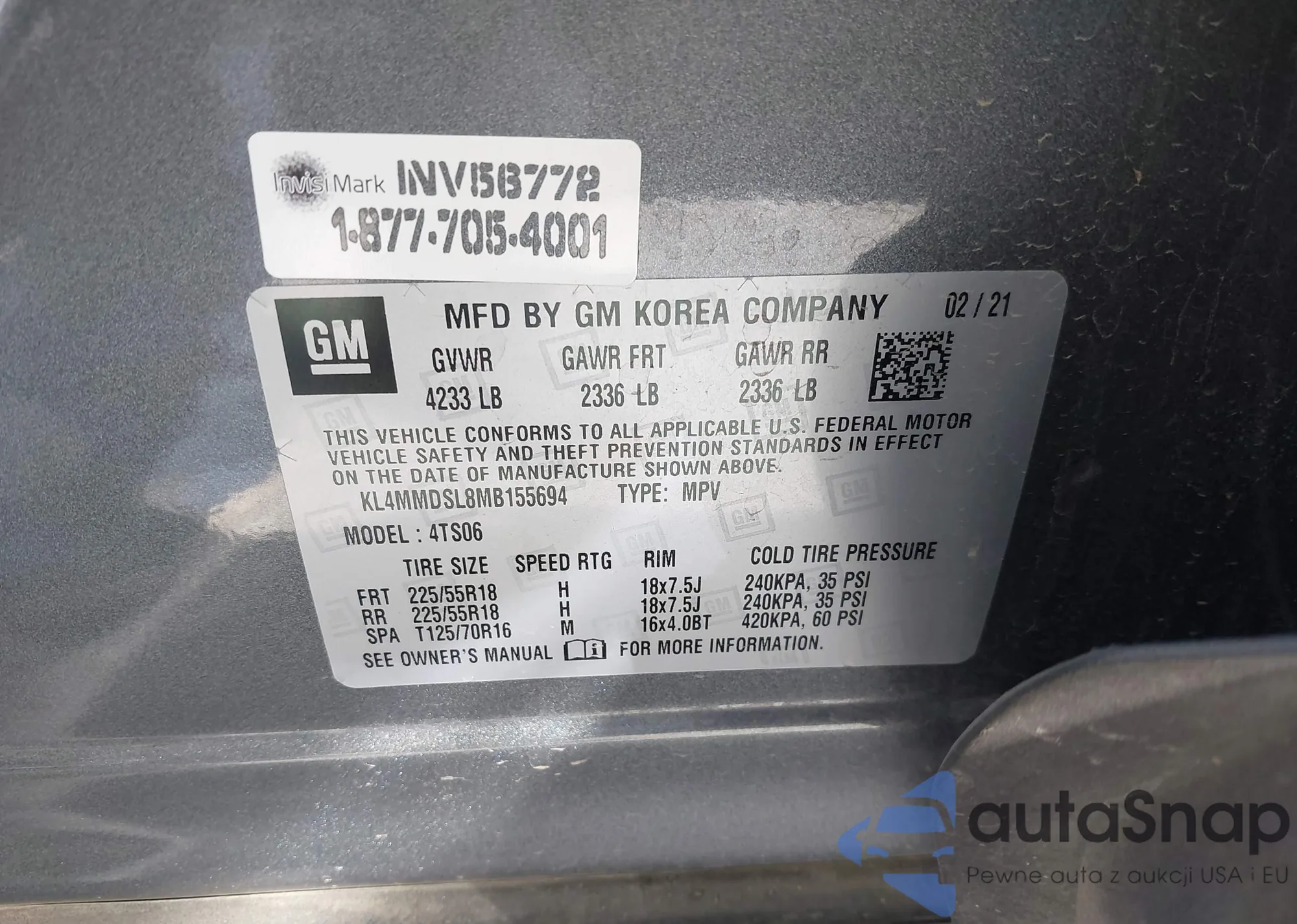 LOT: 43388201 VIN: KL4MMDSL8MB155694