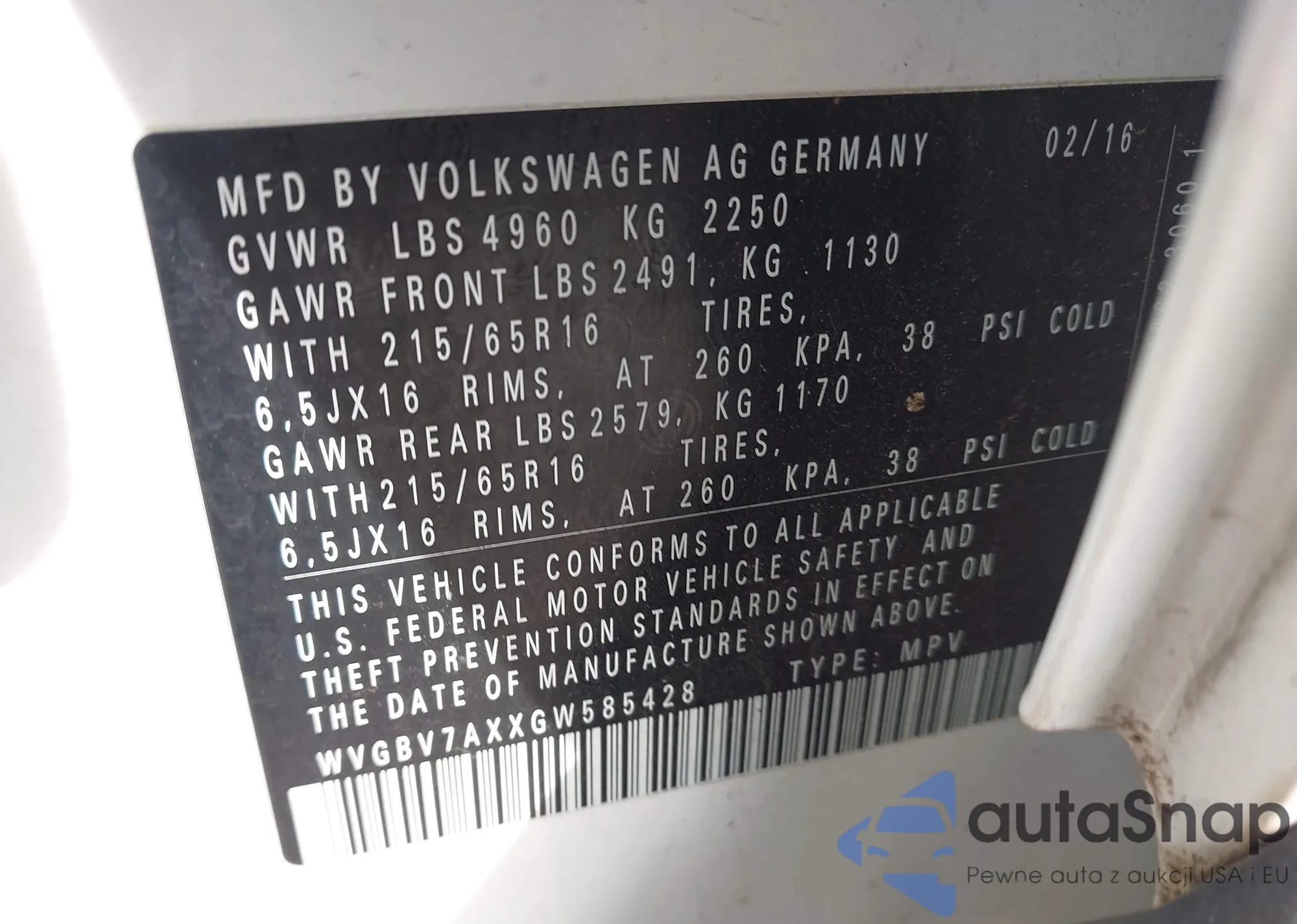 • VIN WVGBV7AXXGW585428