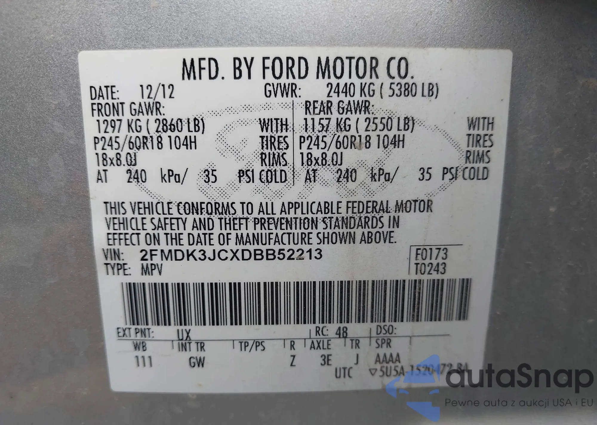 • VIN 2FMDK3JCXDBB52213