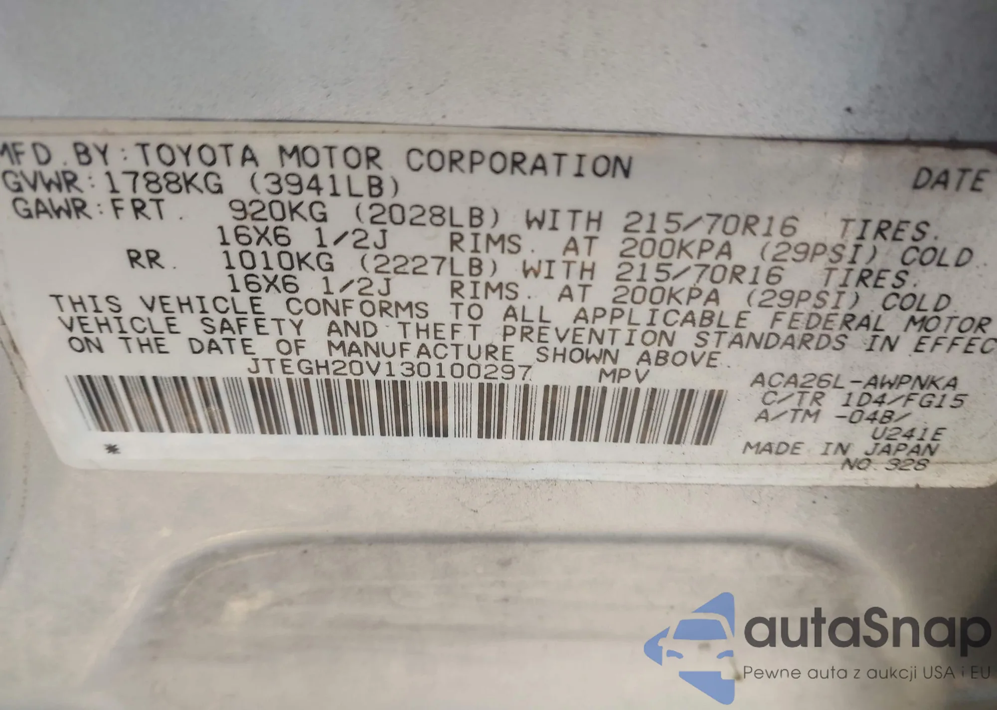 • VIN JTEGH20V130100297