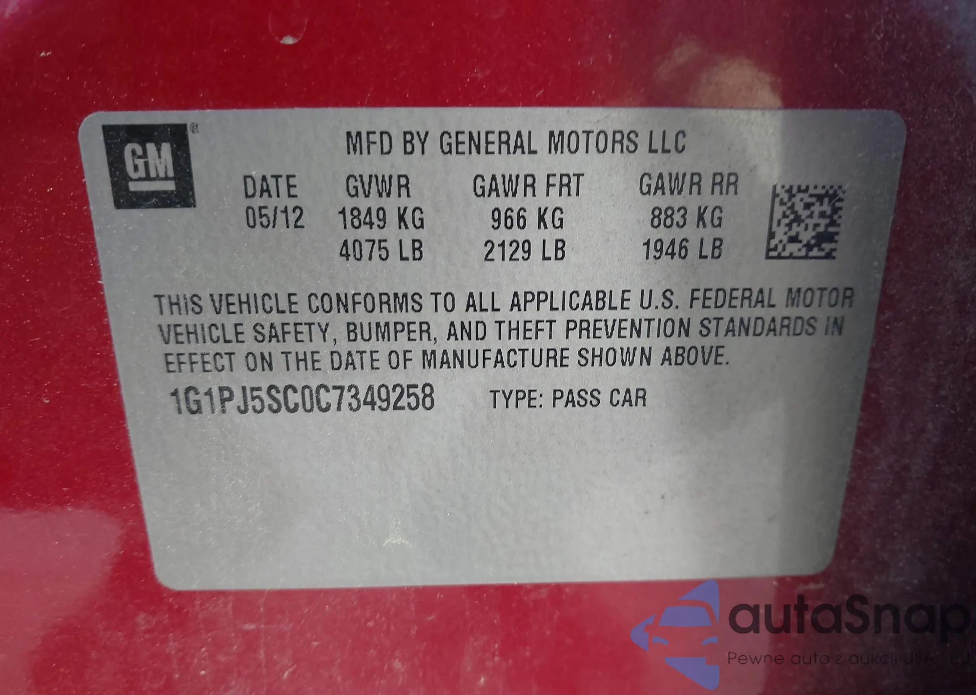 LOT: 43637944 VIN: 1G1PJ5SC0C7349258