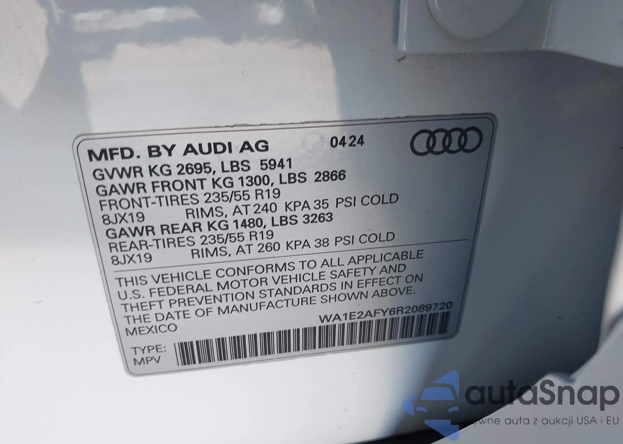 LOT: 43381647 VIN: WBA8E9G5XGNT46738