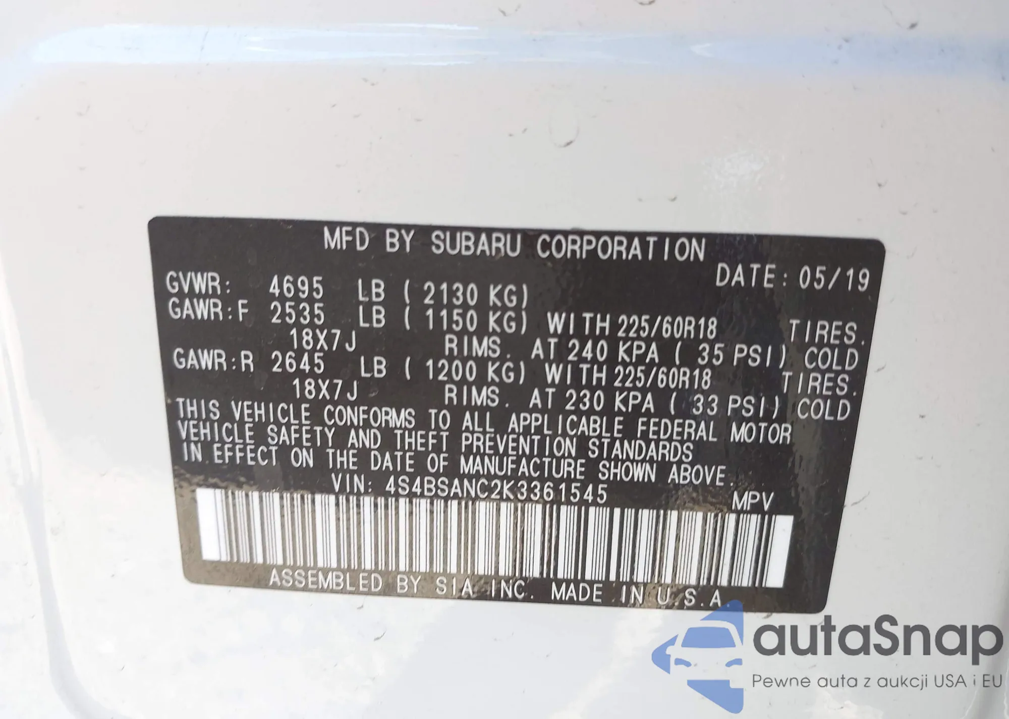 LOT: 43131065 VIN: 4S4BSANC2K3361545