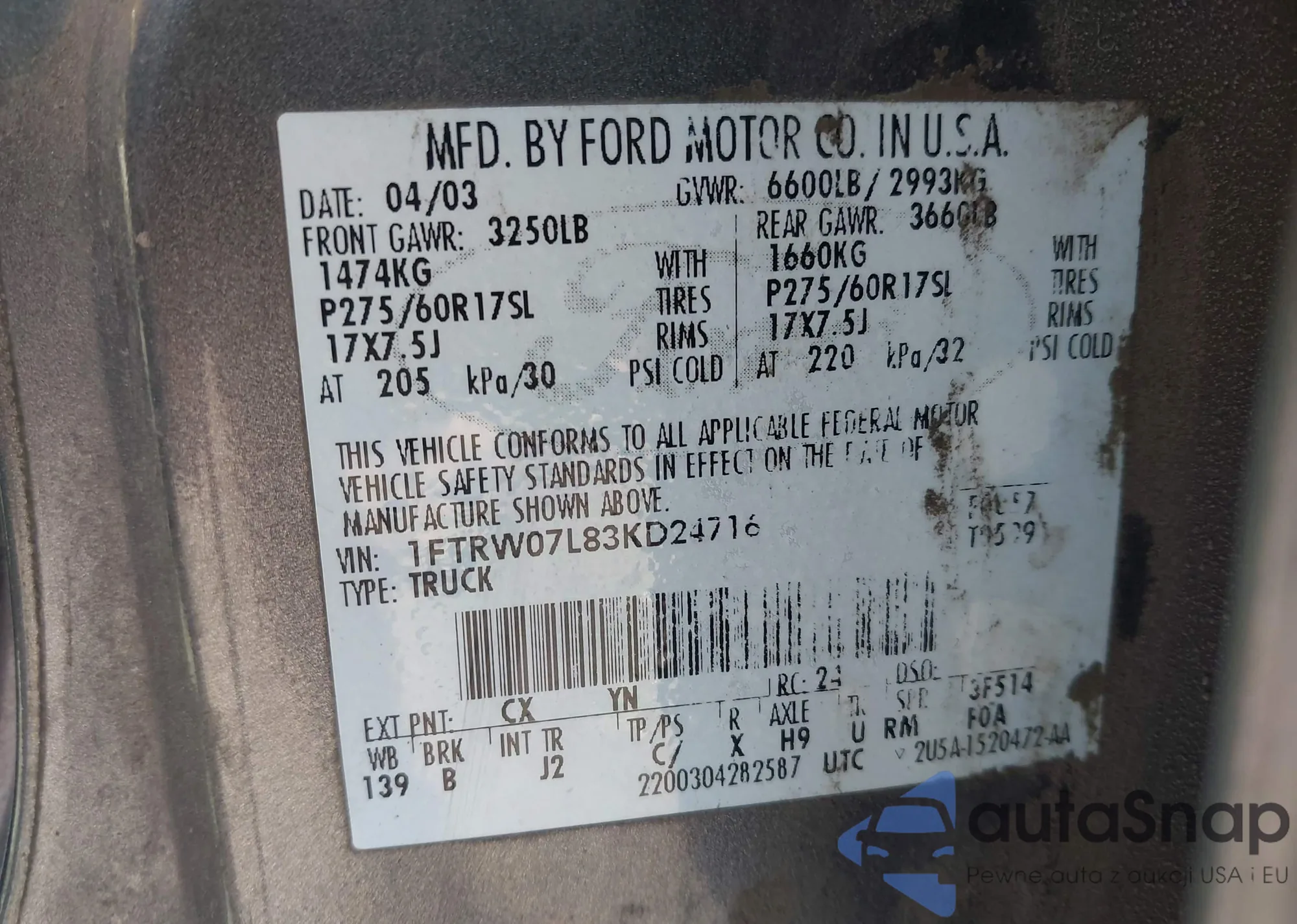 • VIN 1FTRW07L83KD24716