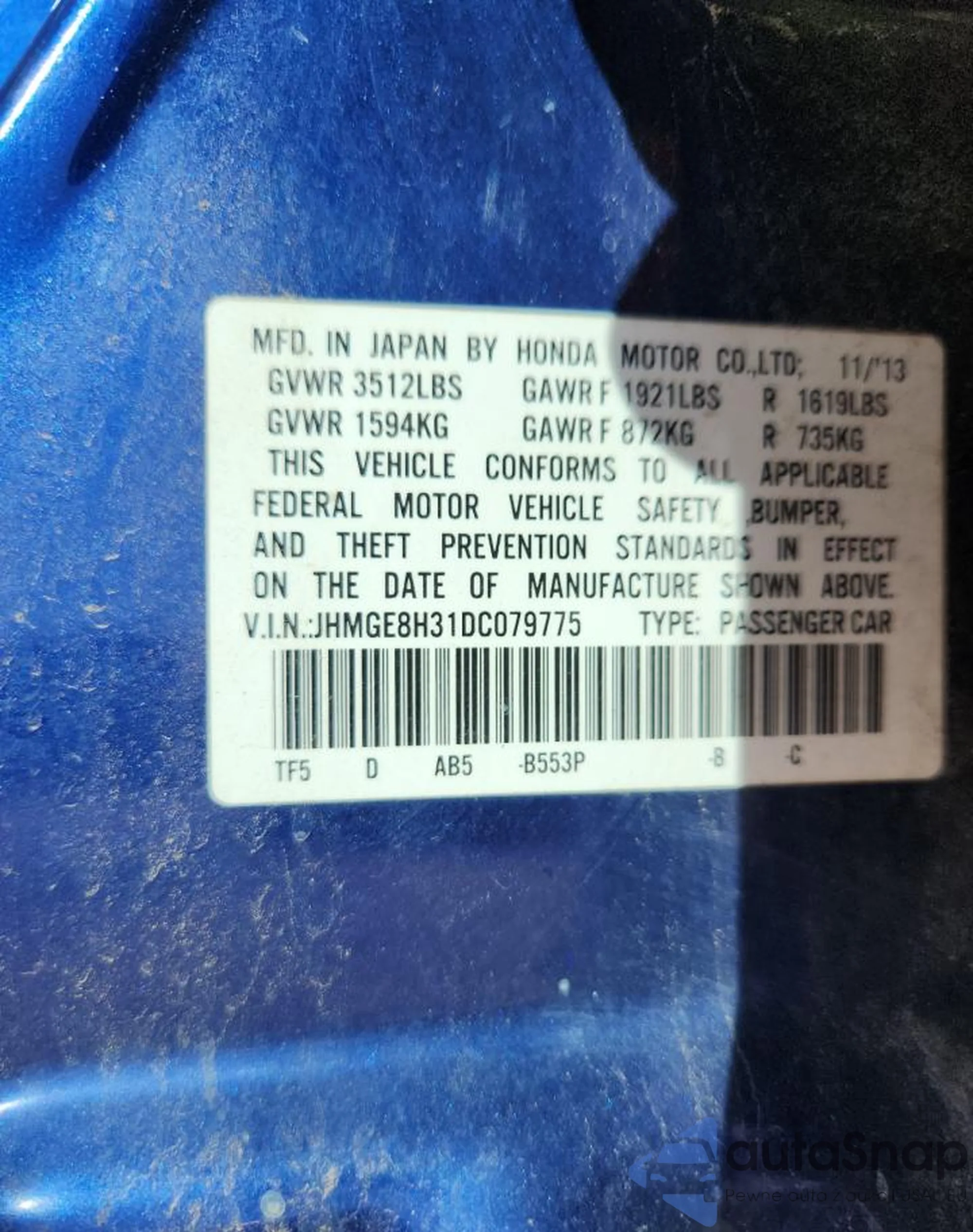 • VIN JHMGE8H31DC079775