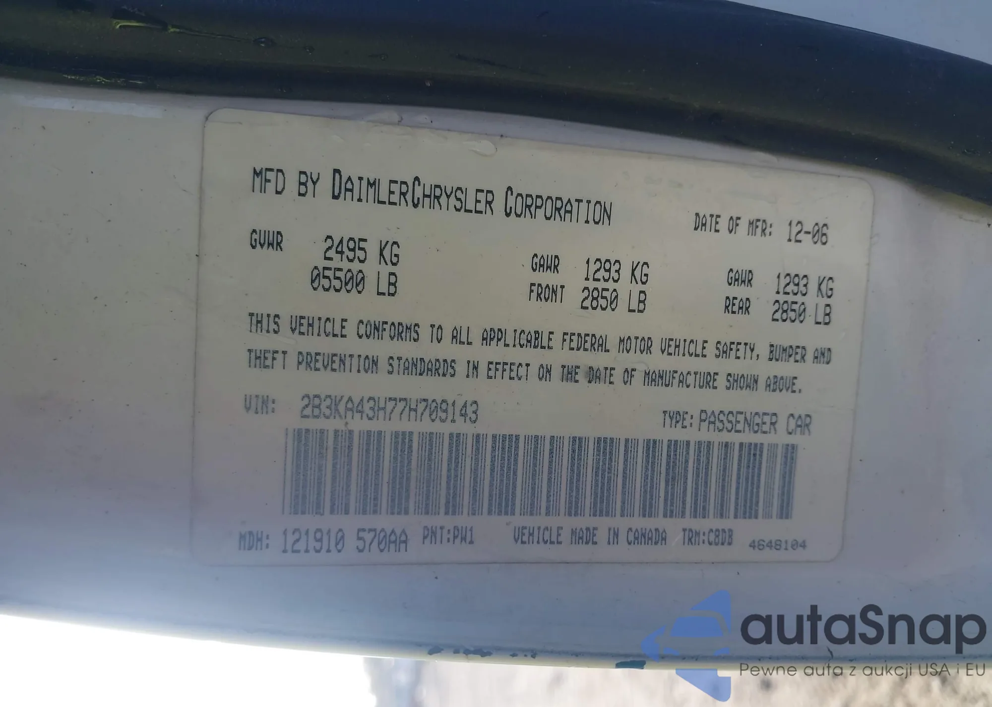 LOT: 43336364 VIN: 2B3KA43H77H709143