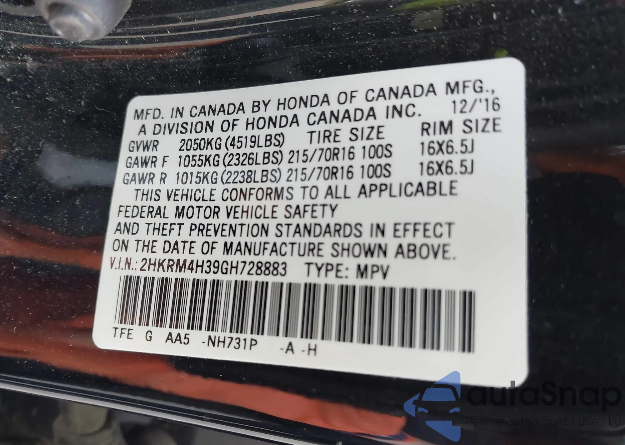 • VIN 2HKRM4H39GH728883