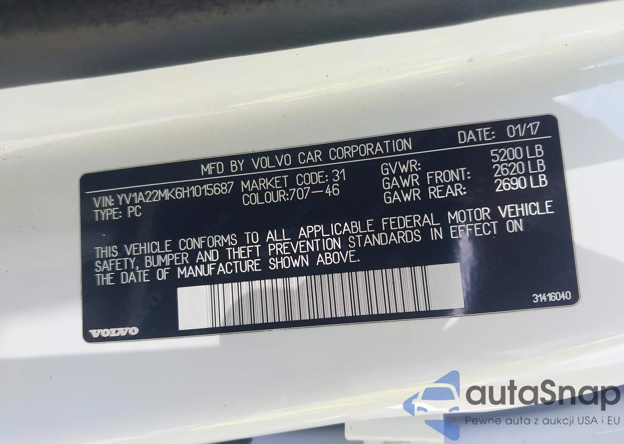 LOT: 43361800 VIN: YV1A22MK6H1015687