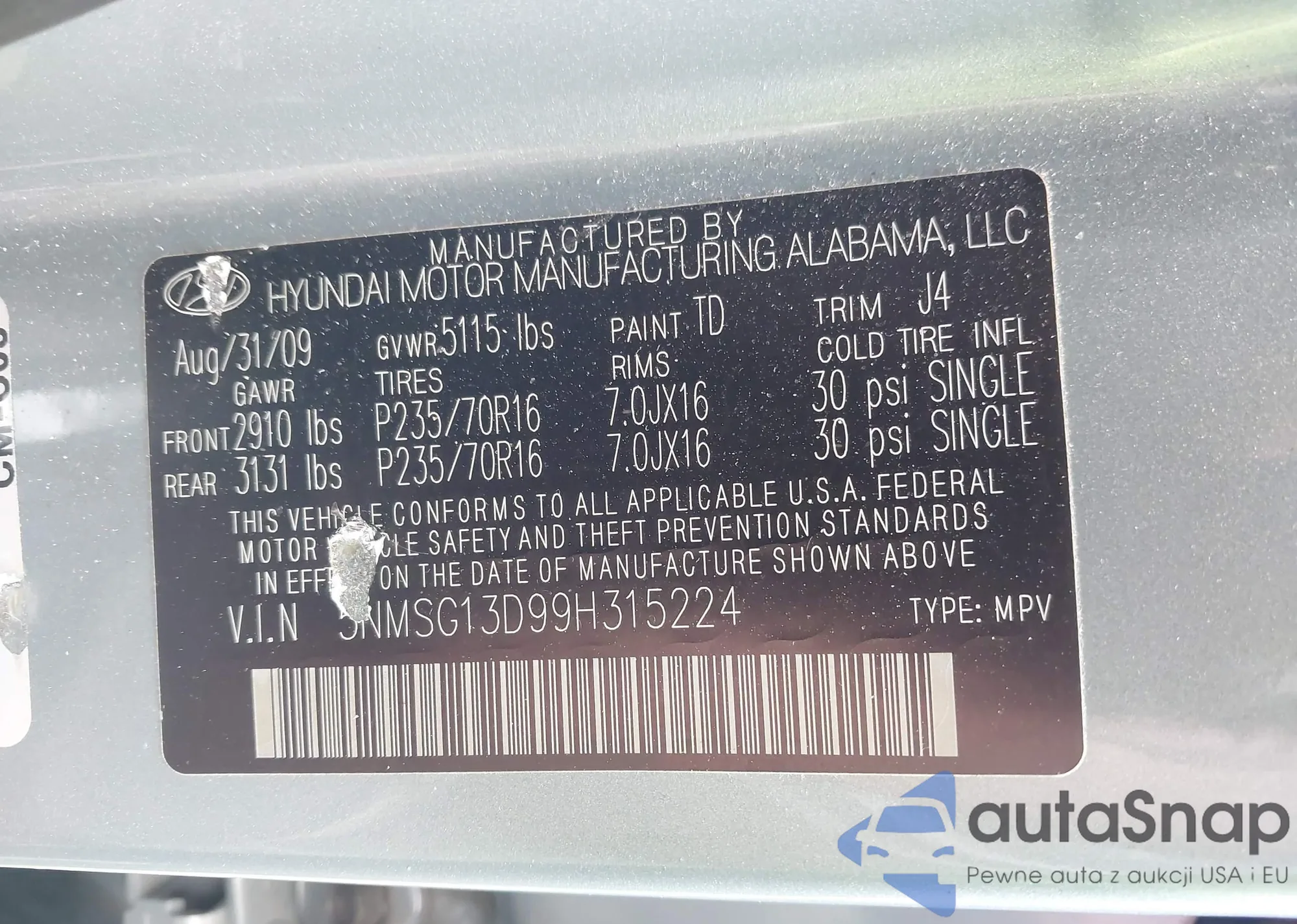 • VIN 5NMSG13D99H315224