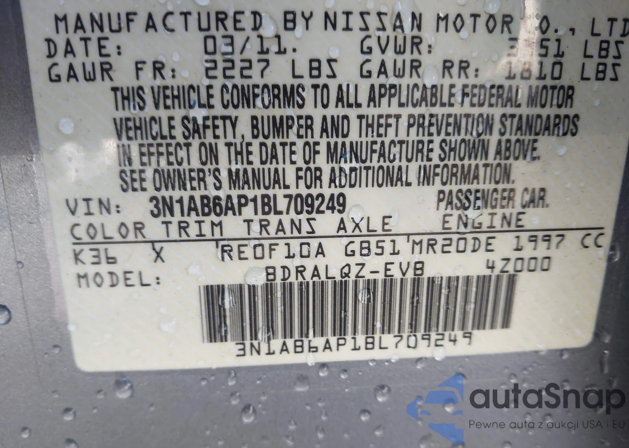 • VIN 3N1AB6AP1BL709249