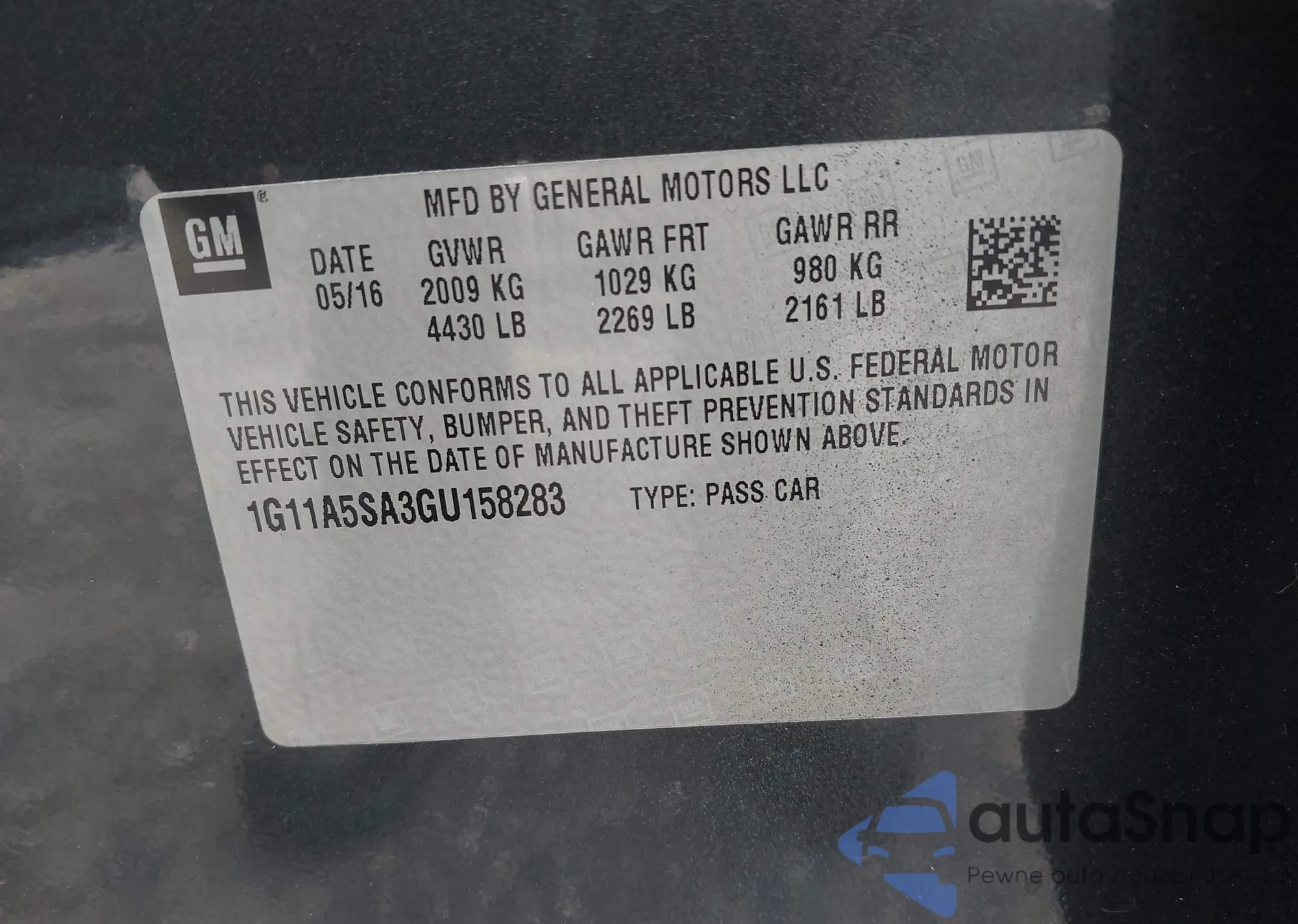 LOT: 43371833 VIN: 1G11A5SA3GU158283