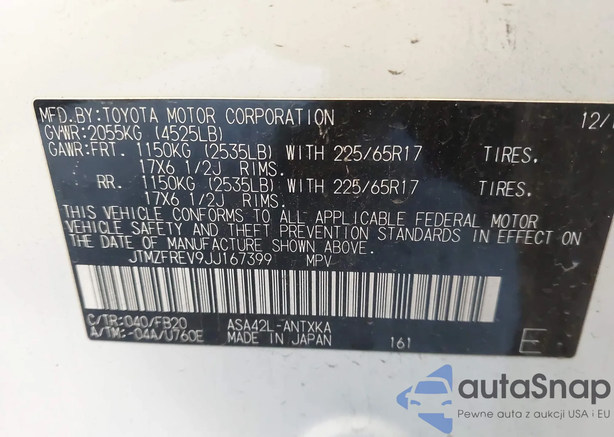 LOT: 43487086 VIN: JTMZFREV9JJ167399