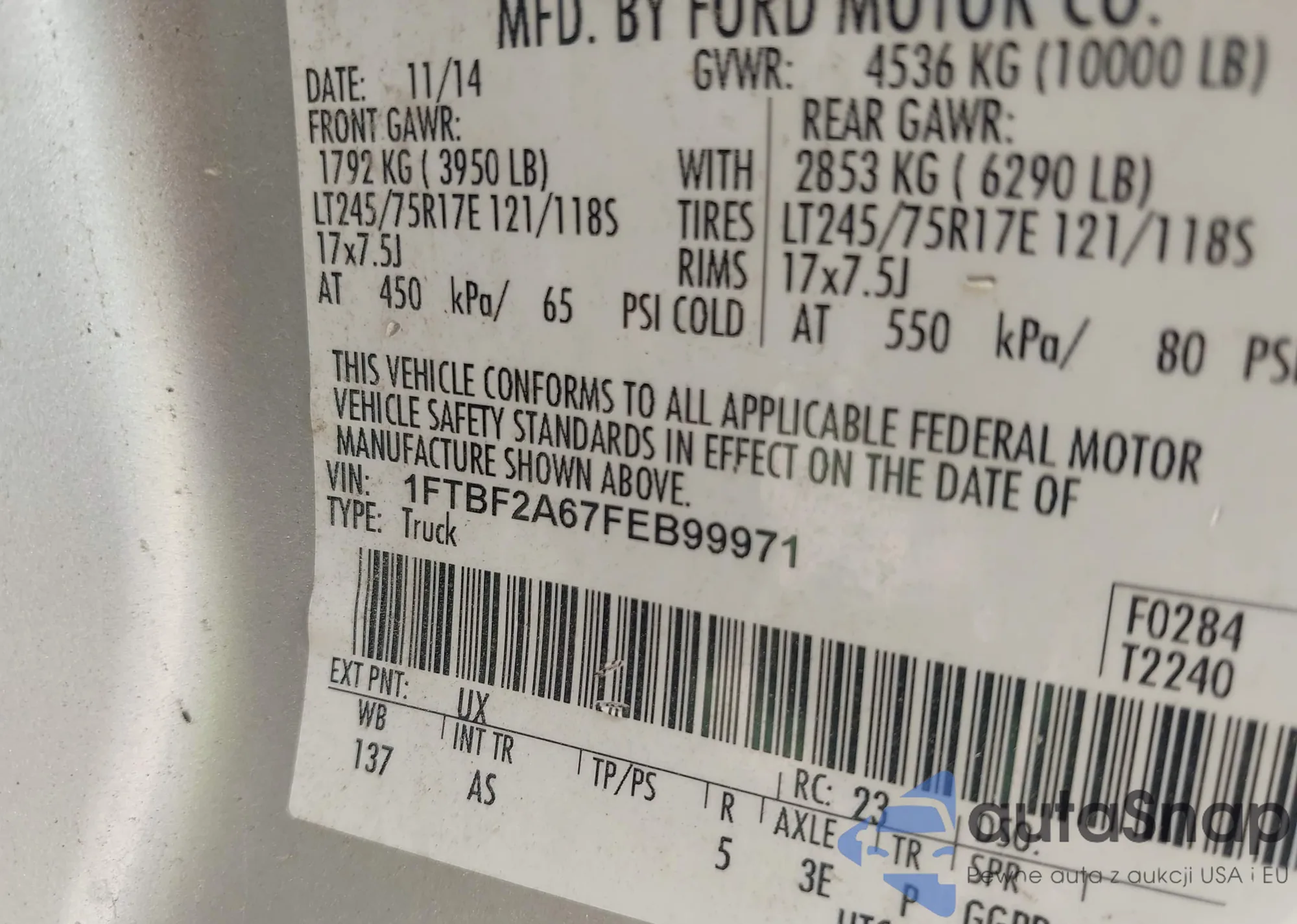 LOT: 43045005 VIN: 1FTBF2A67FEB99971