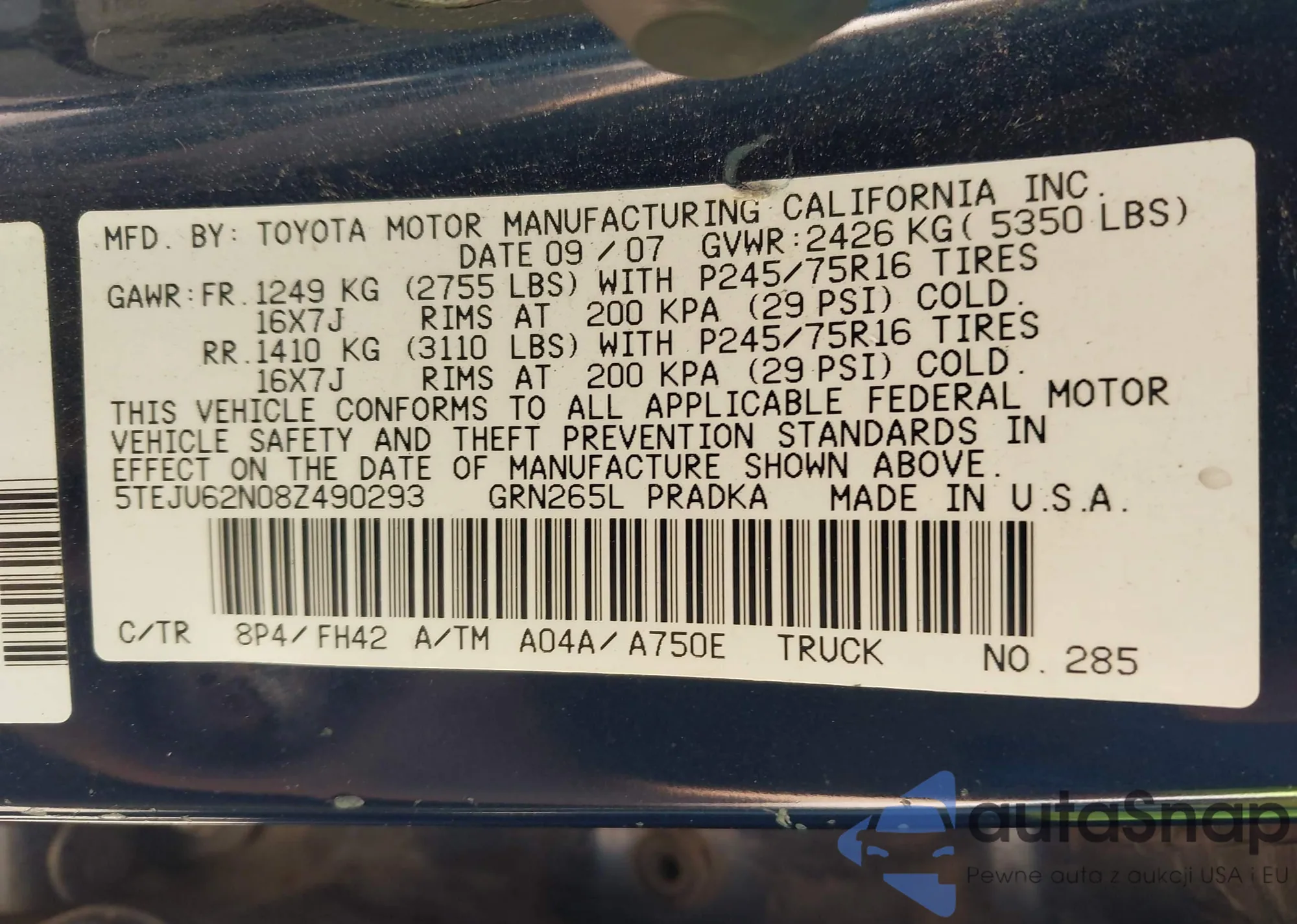 • VIN 5TEJU62N08Z490293