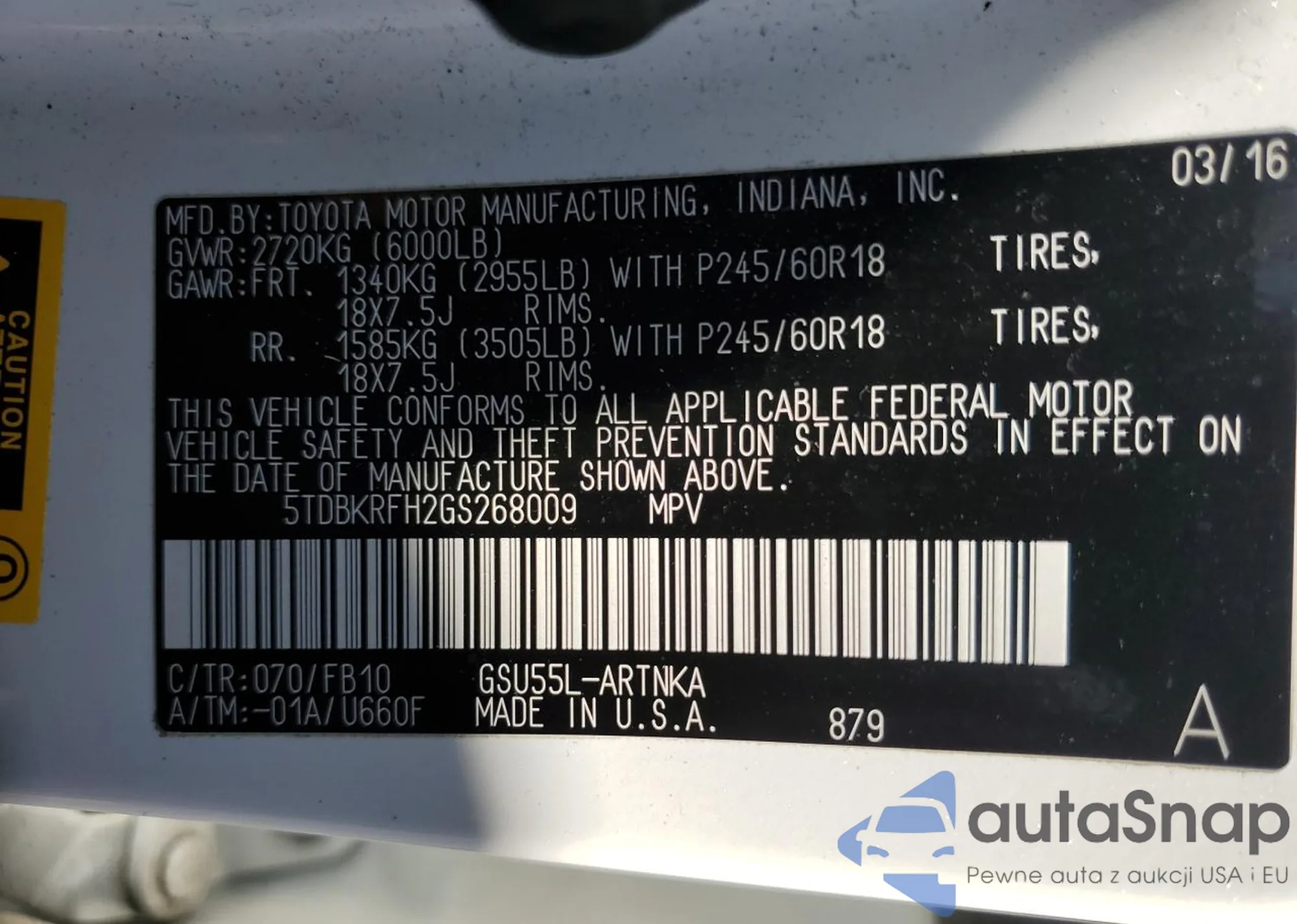 LOT: 85676055 VIN: 5TDBKRFH2GS268009