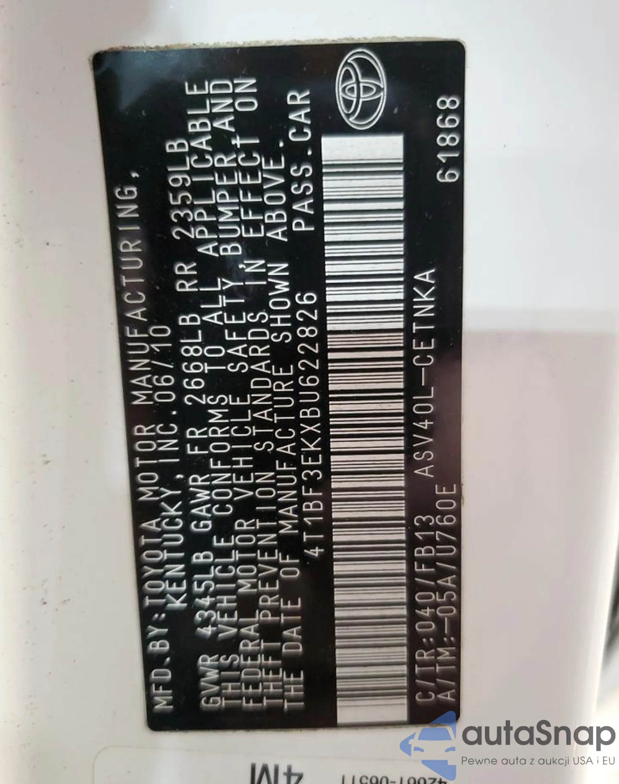 LOT: 82539845 VIN: 4T1G11AK7MU603359