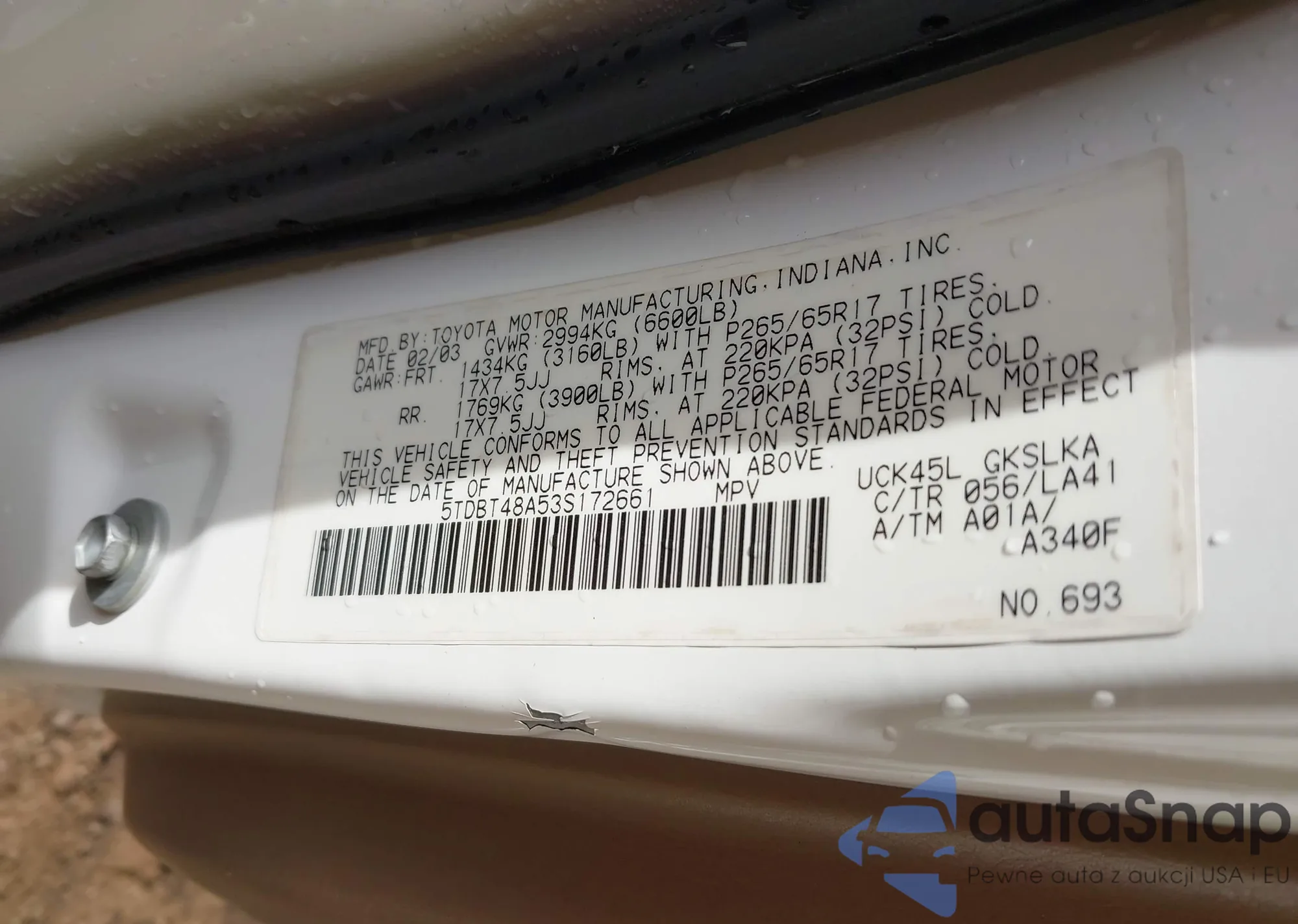 LOT: 43609297 VIN: 5TDBT48A53S172661