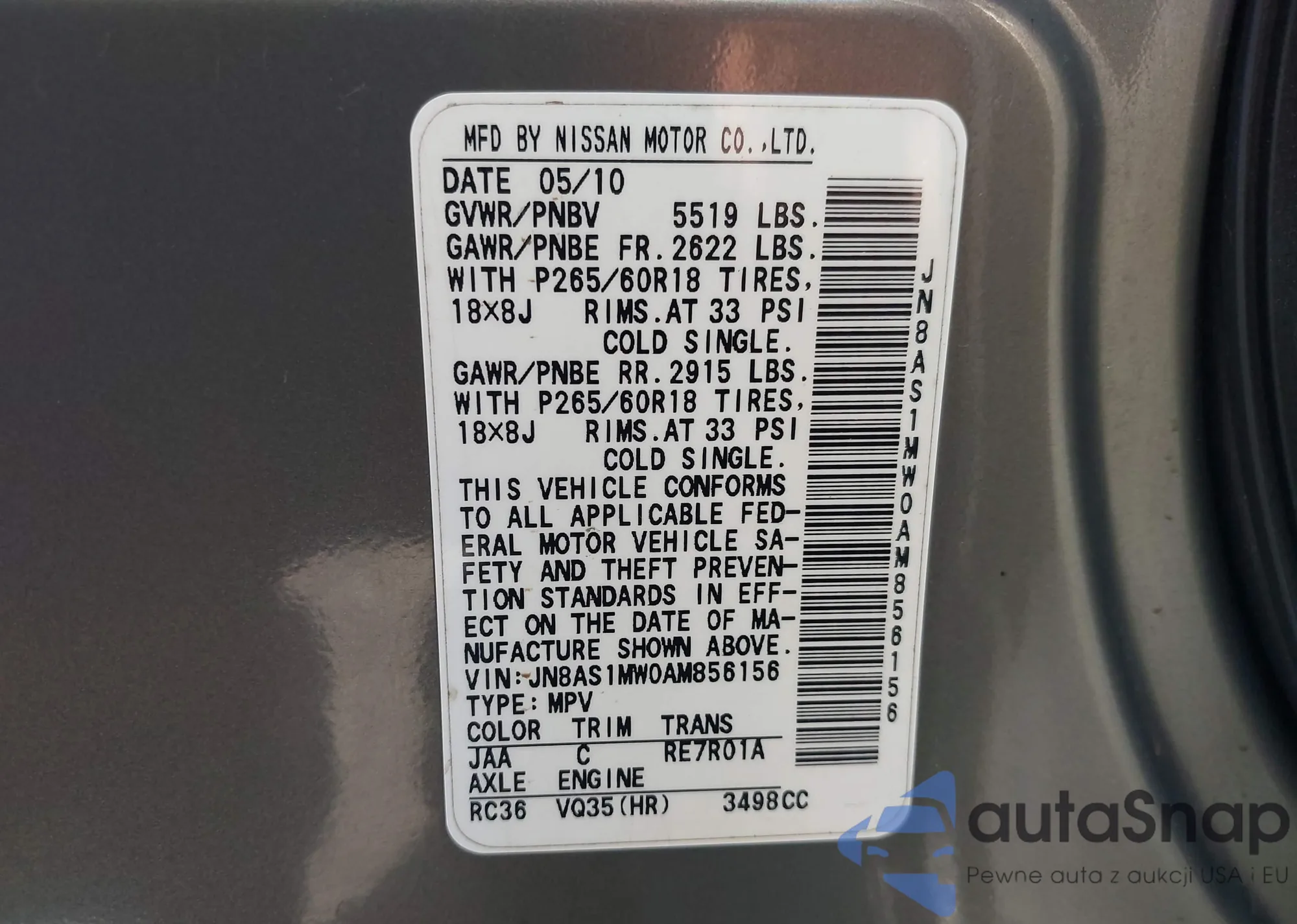 • VIN 1N4AA5AP4AC806147