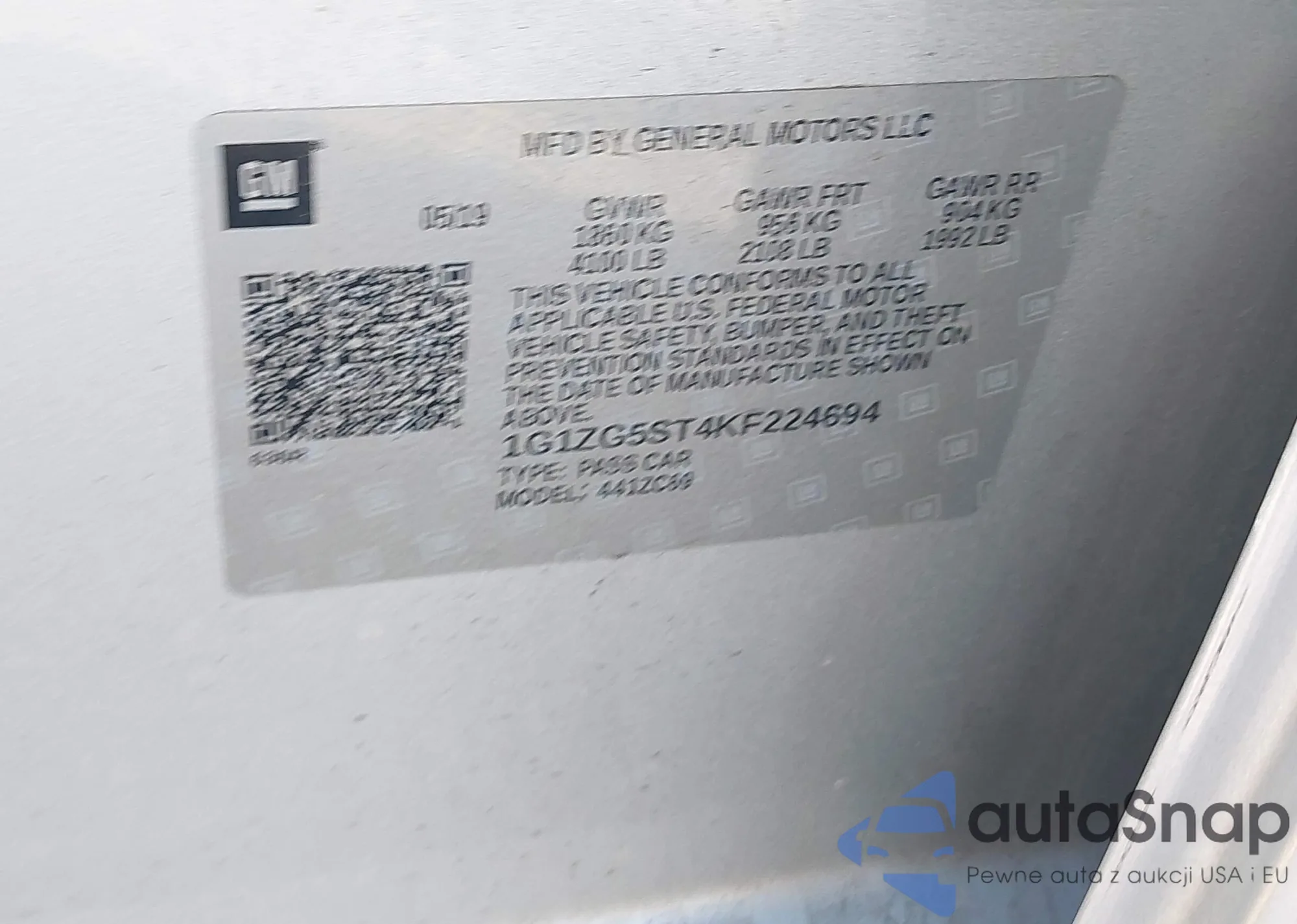• VIN 1G1ZG5ST4KF224694