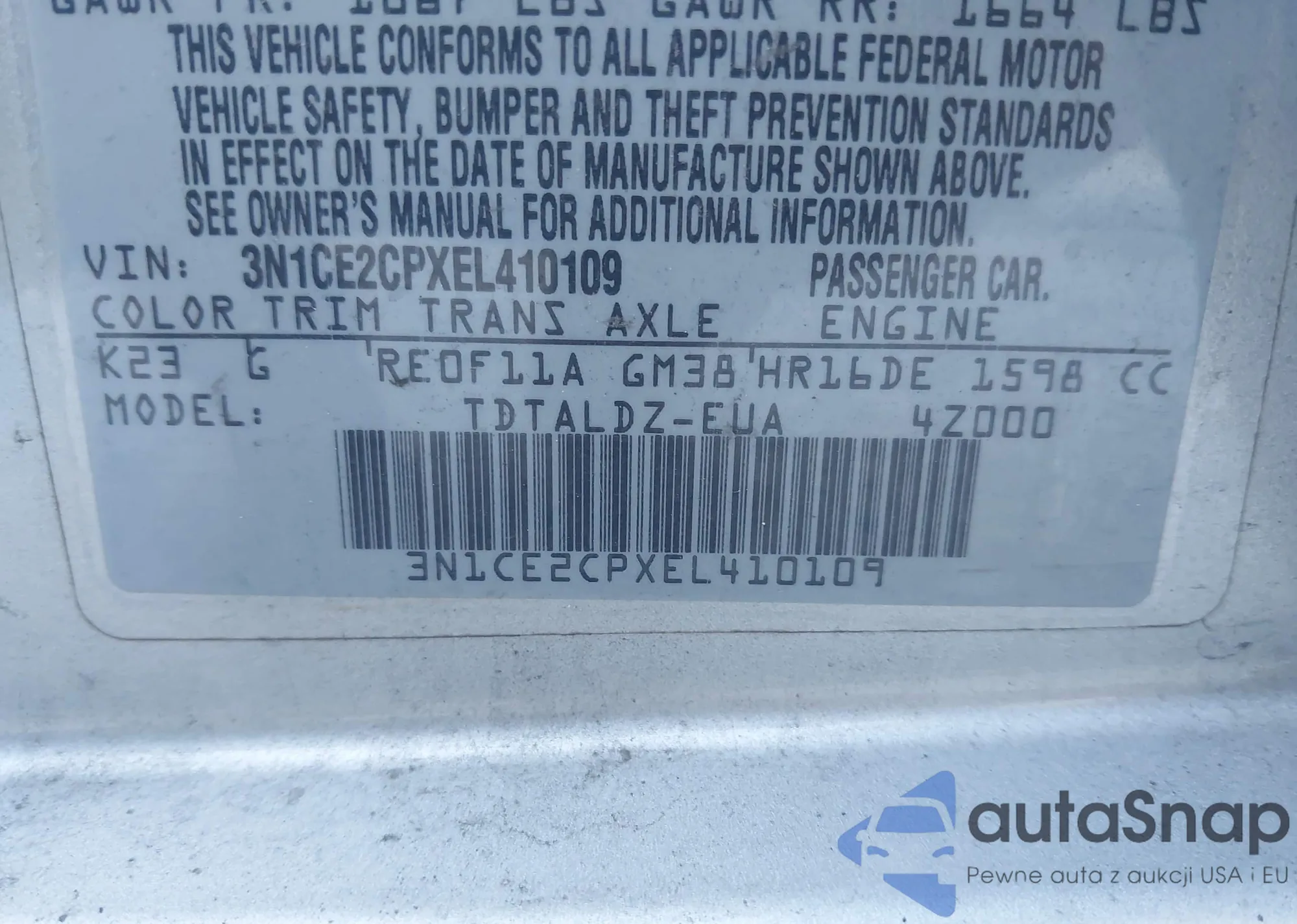 • VIN 3N1CE2CPXEL410109