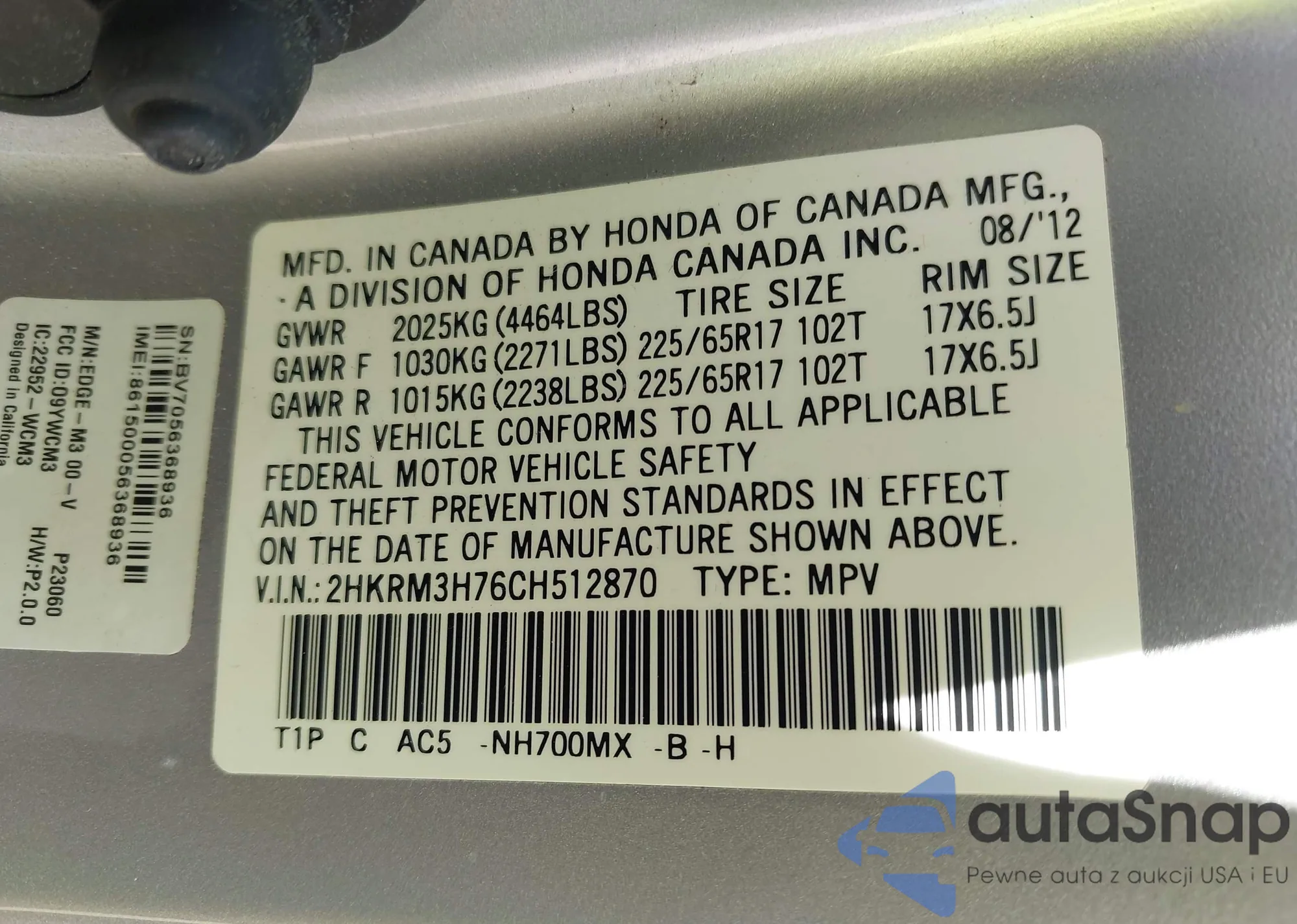 • VIN 2HKRM3H76CH512870