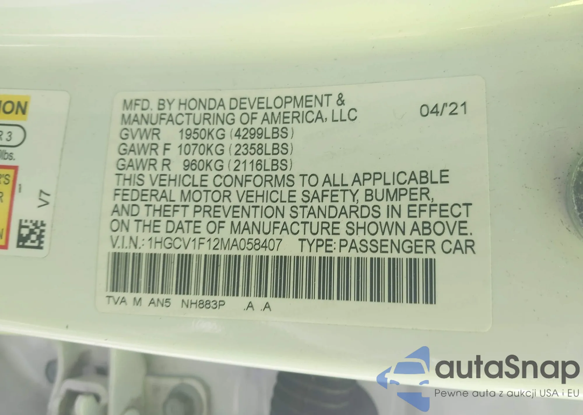 LOT: 43215836 VIN: 1HGCV1F12MA058407
