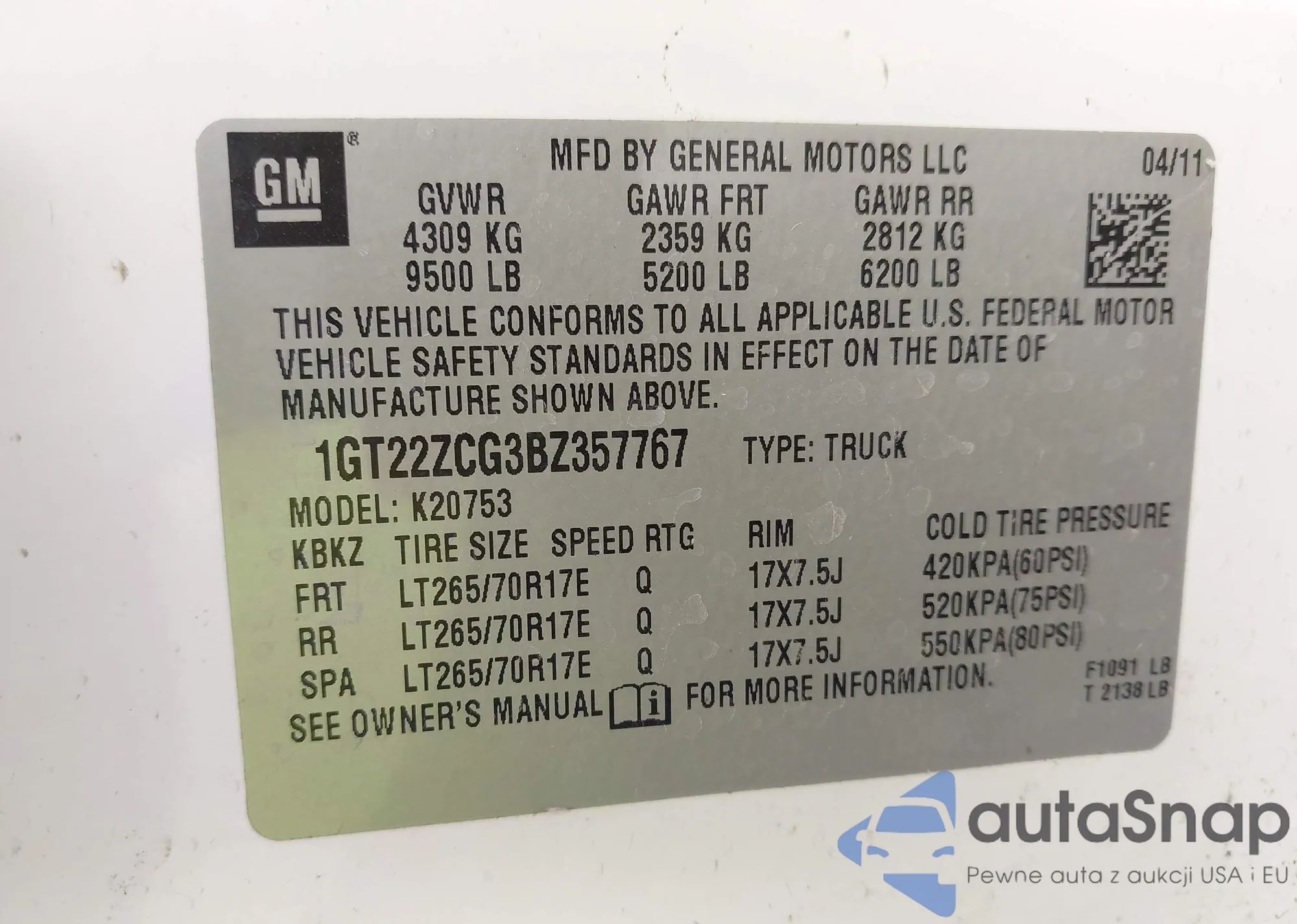 • VIN 1GT22ZCG3BZ357767