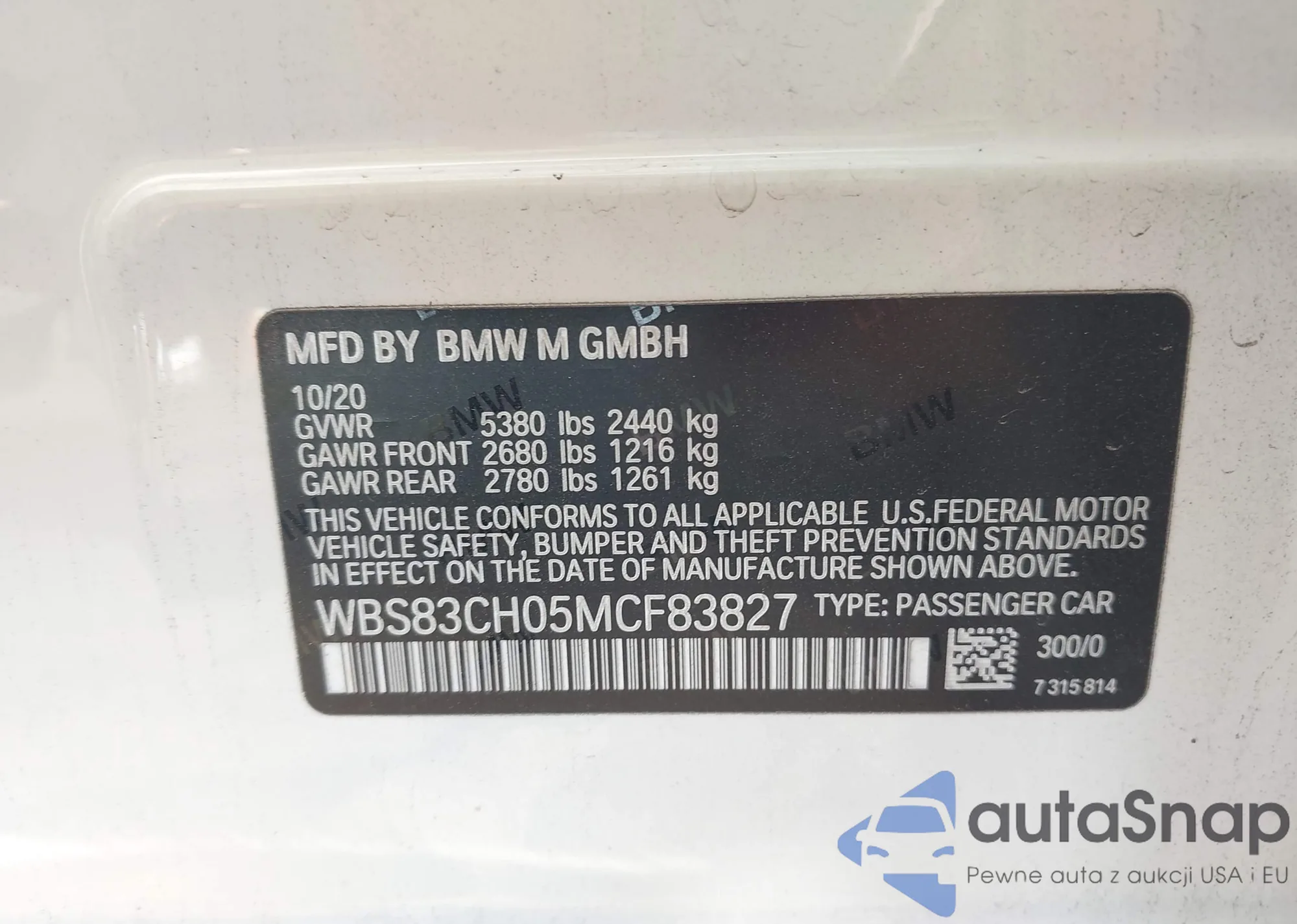LOT: 43016080 VIN: WBS83CH05MCF83827
