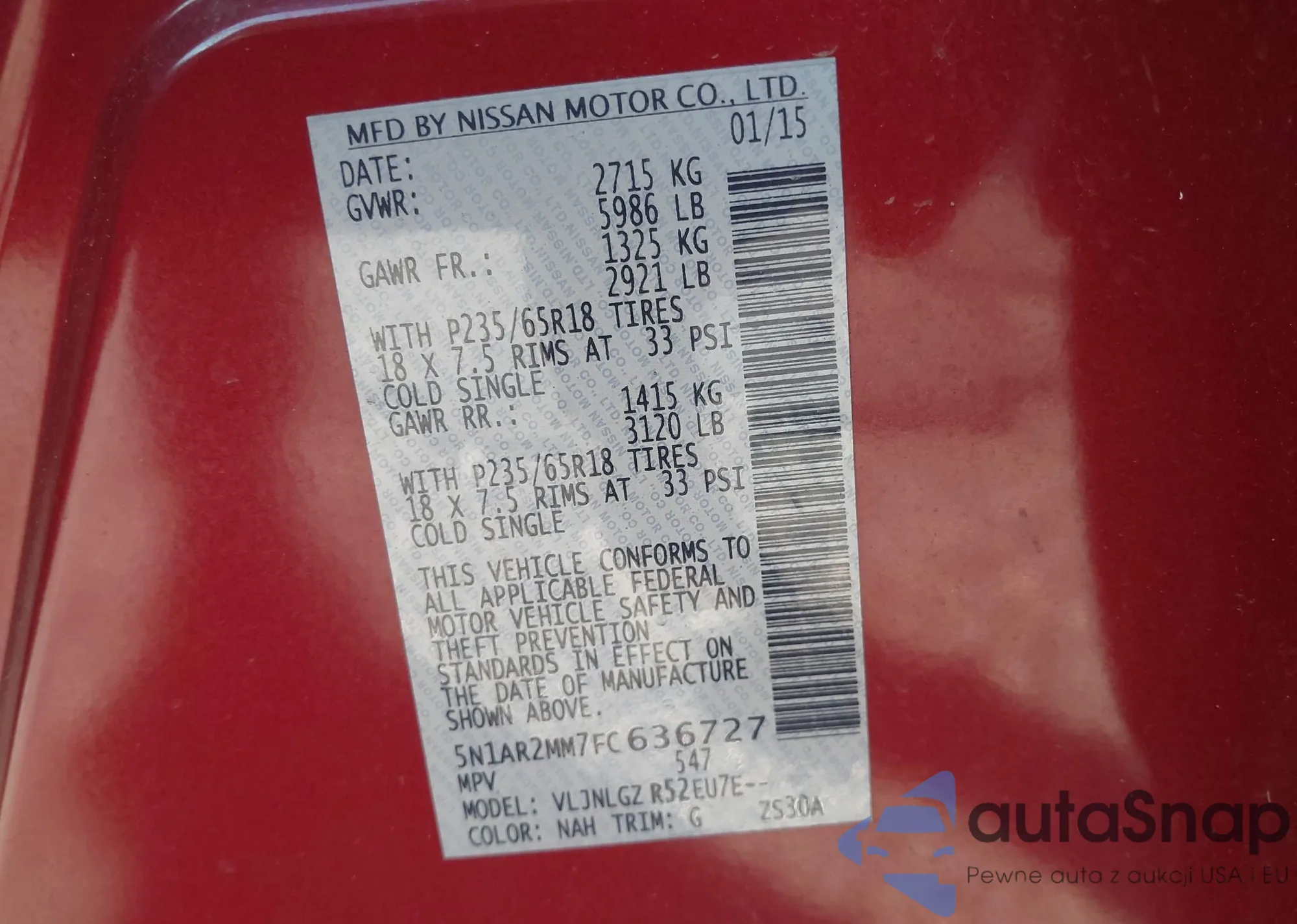 LOT: 43395427 VIN: 5N1AR2MM7FC636727