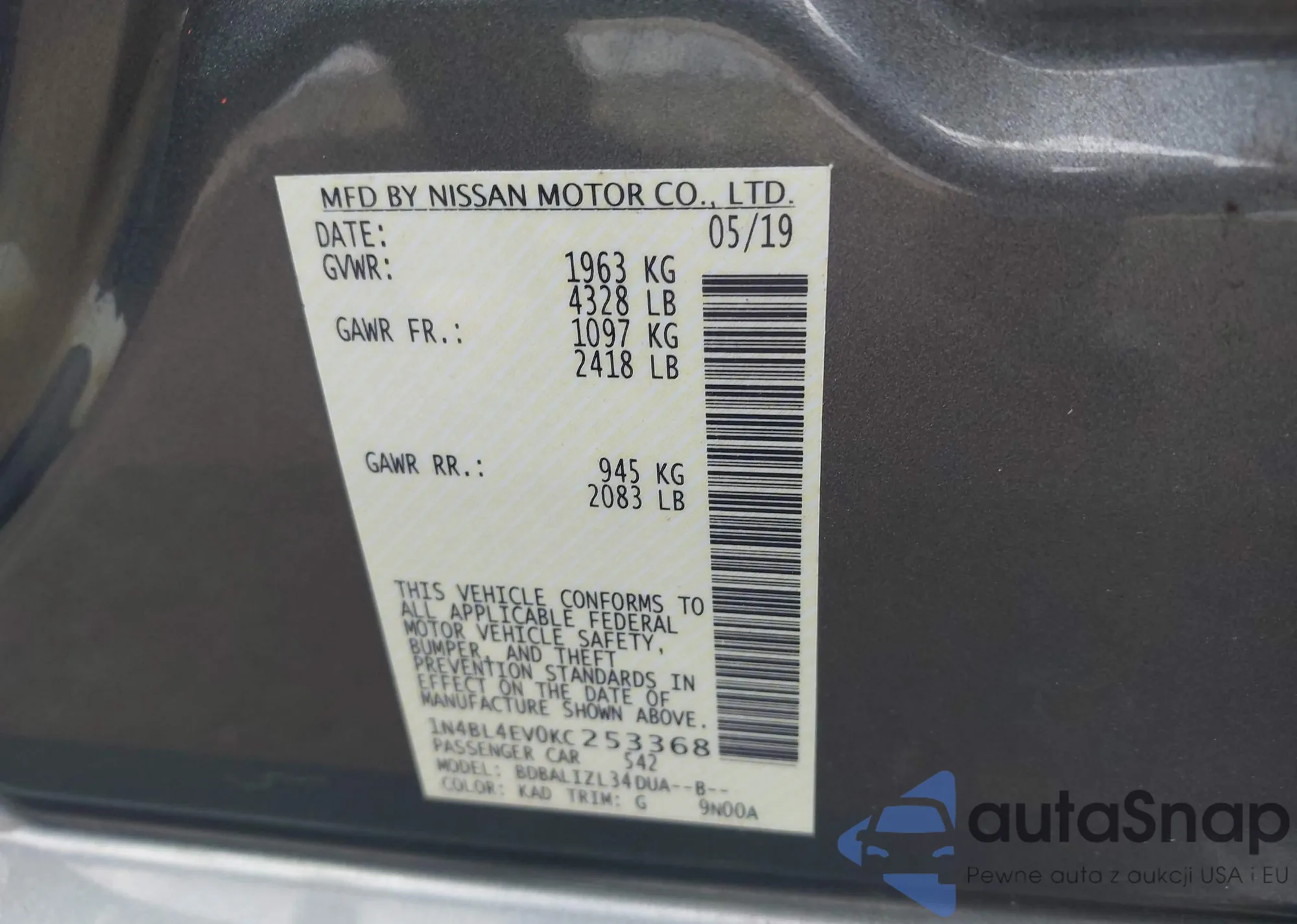 LOT: 43338873 VIN: 1N4BL4EV0KC253368
