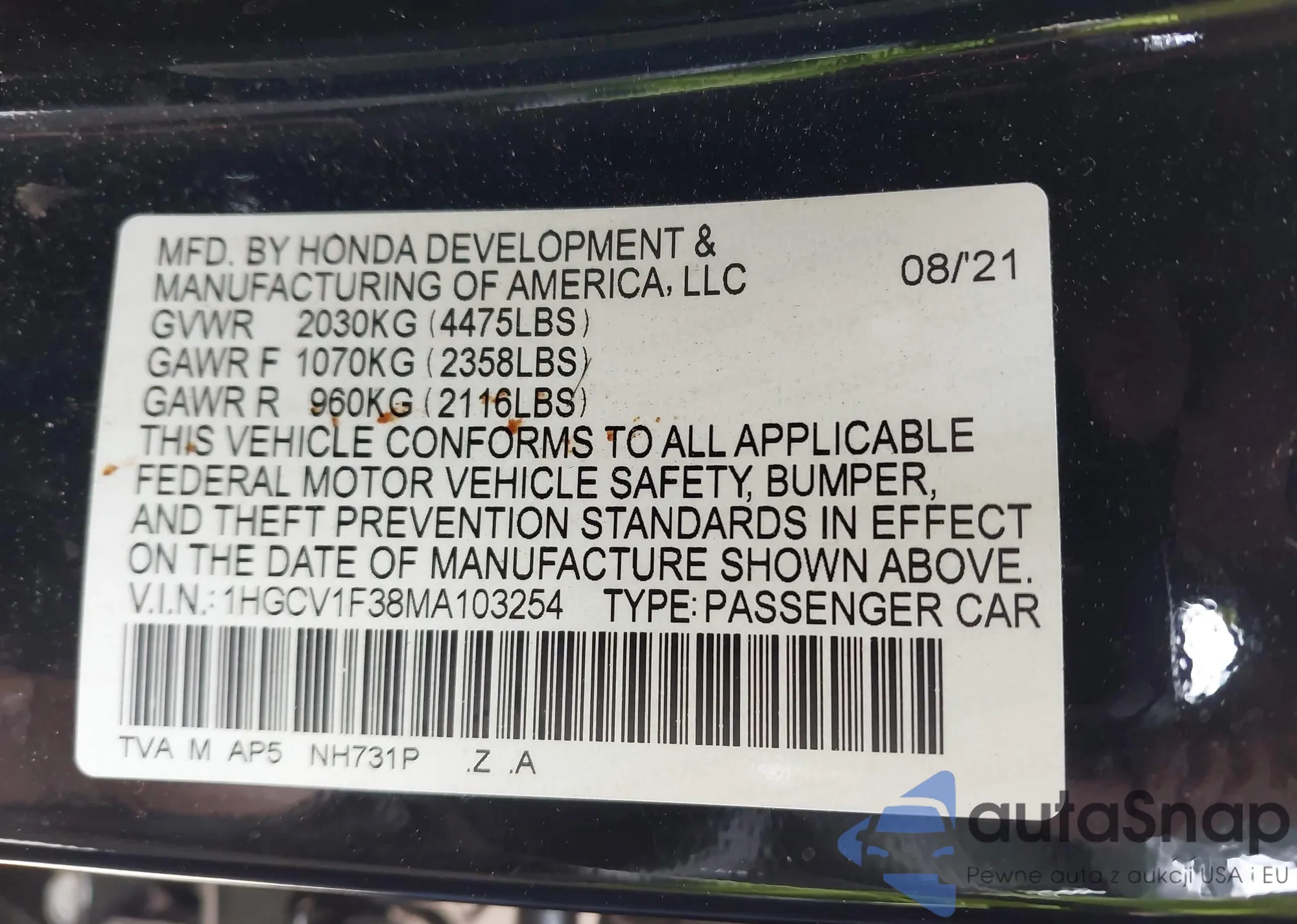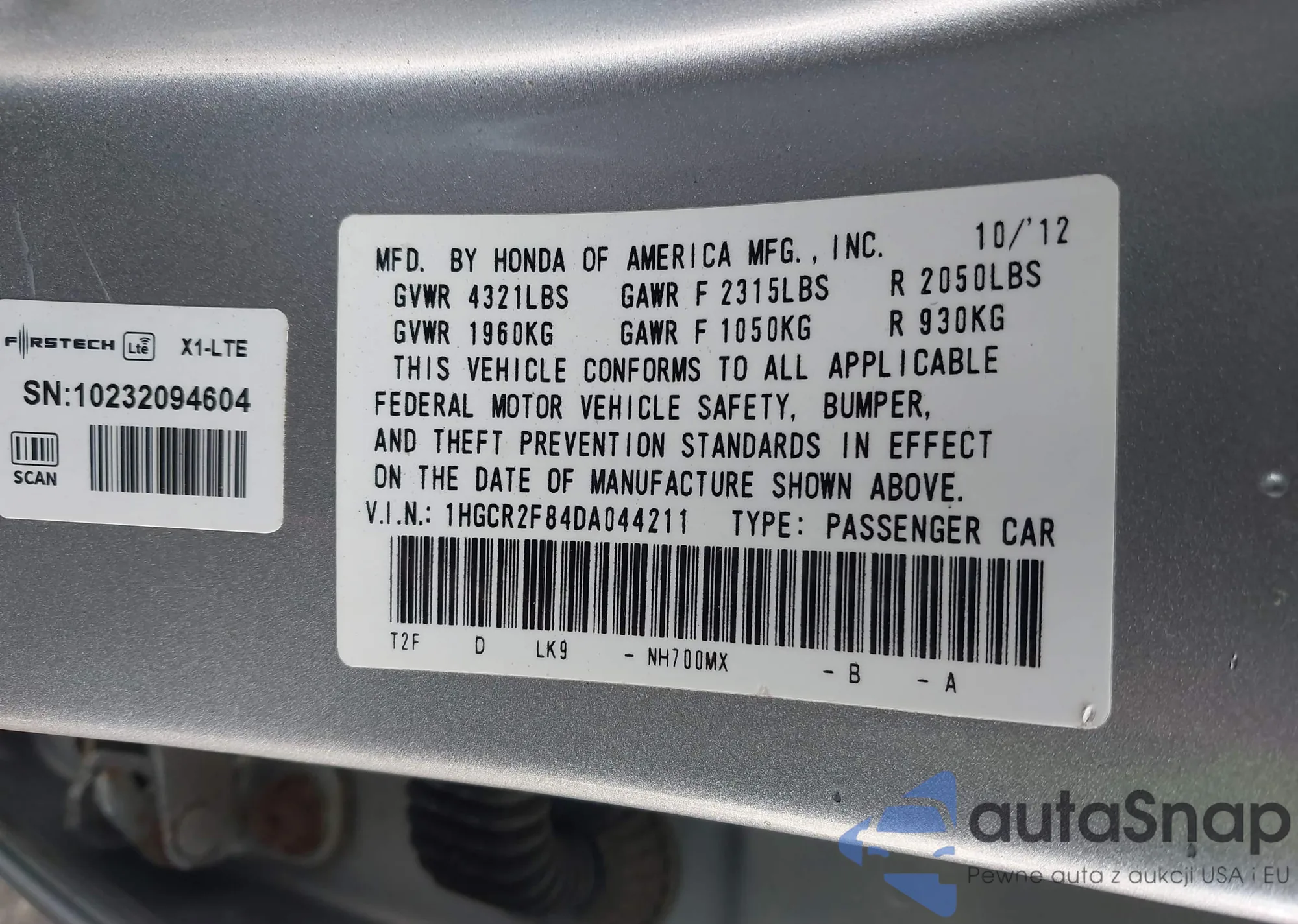• VIN 1HGCR2F84DA044211