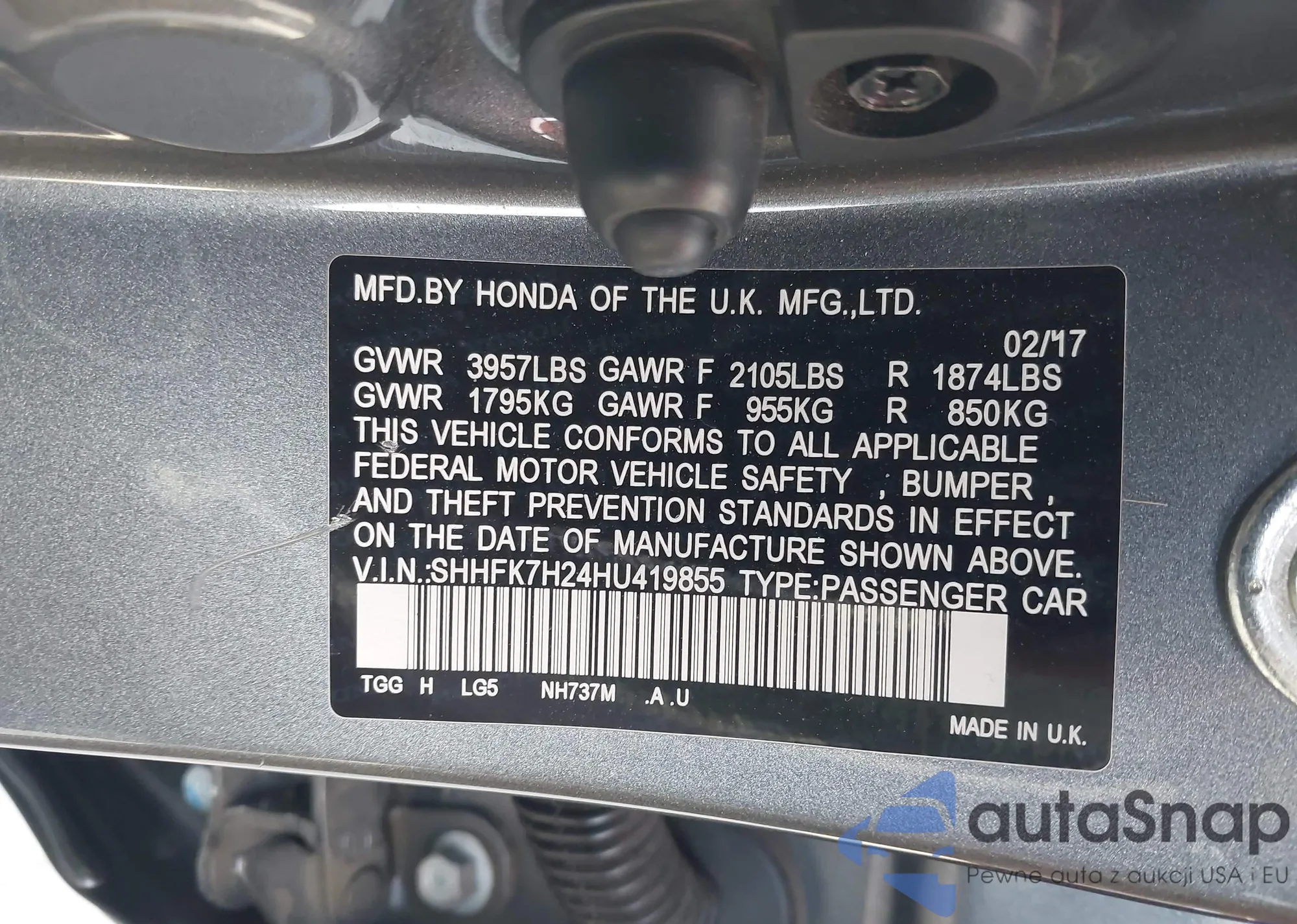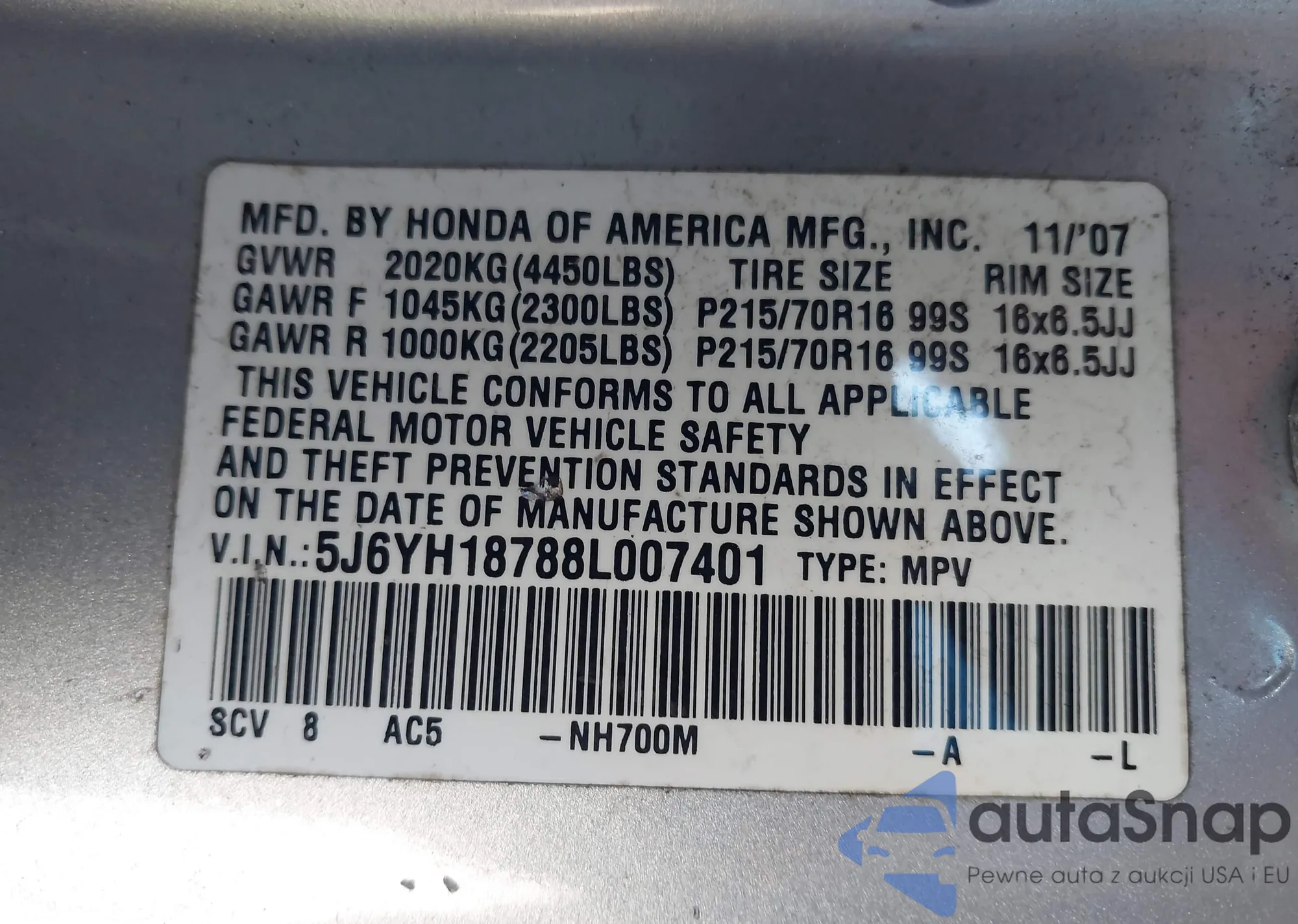 • VIN 5J6YH18788L007401