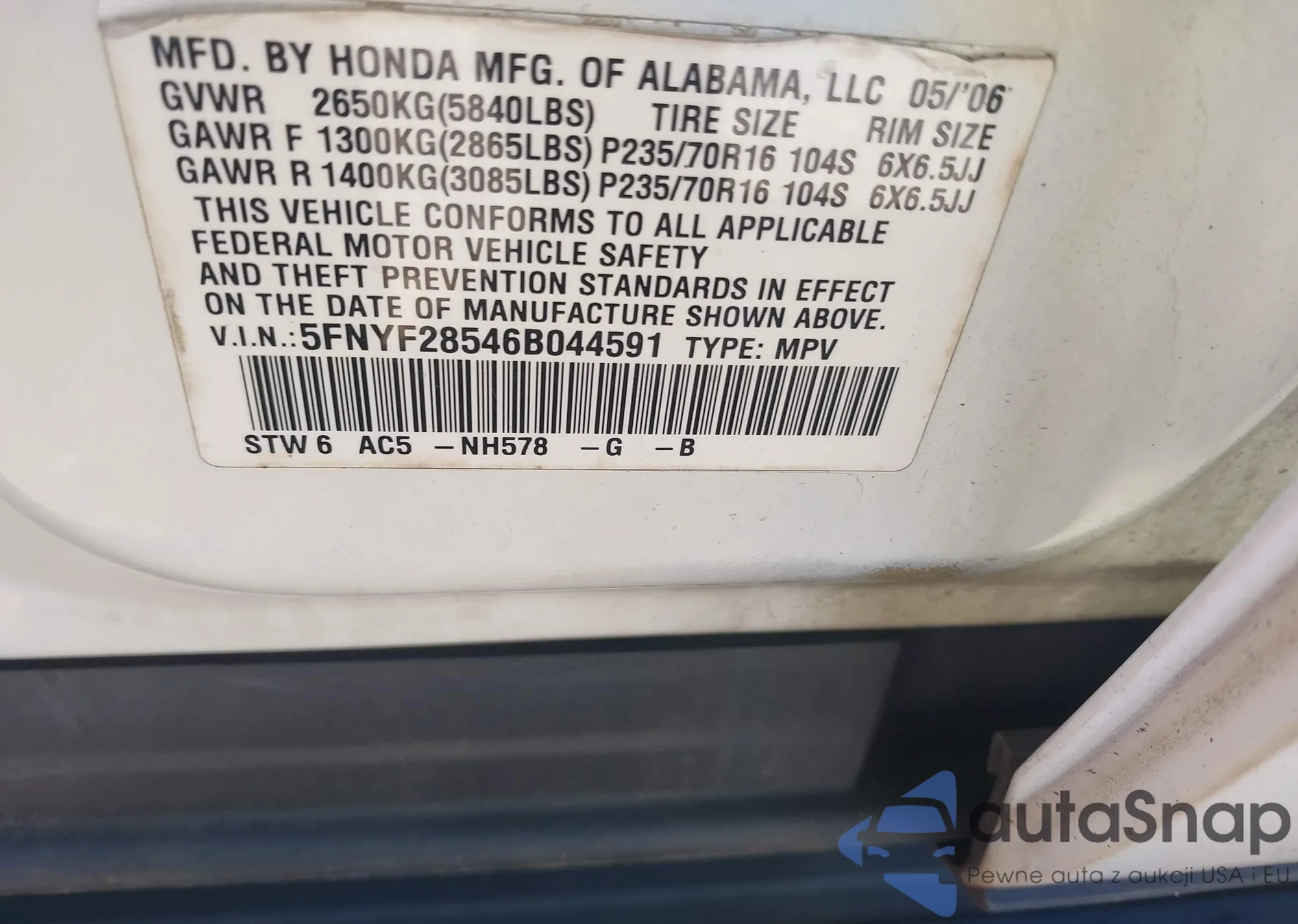 LOT: 43527858 VIN: 5FNYF28546B044591