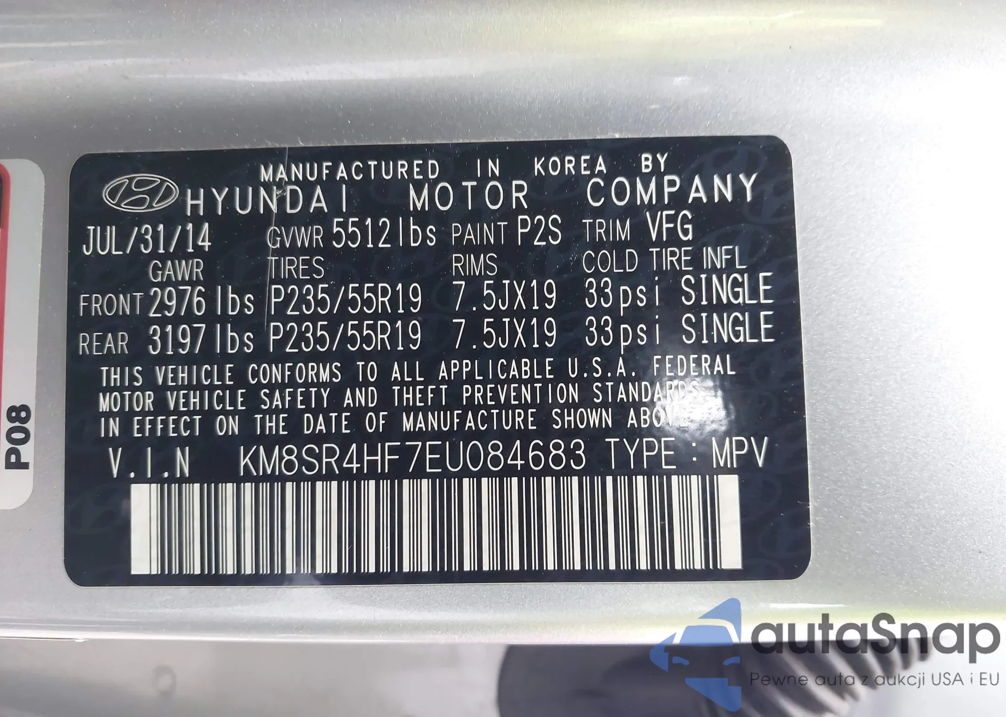 LOT: 43609061 VIN: KM8SR4HF7EU084683
