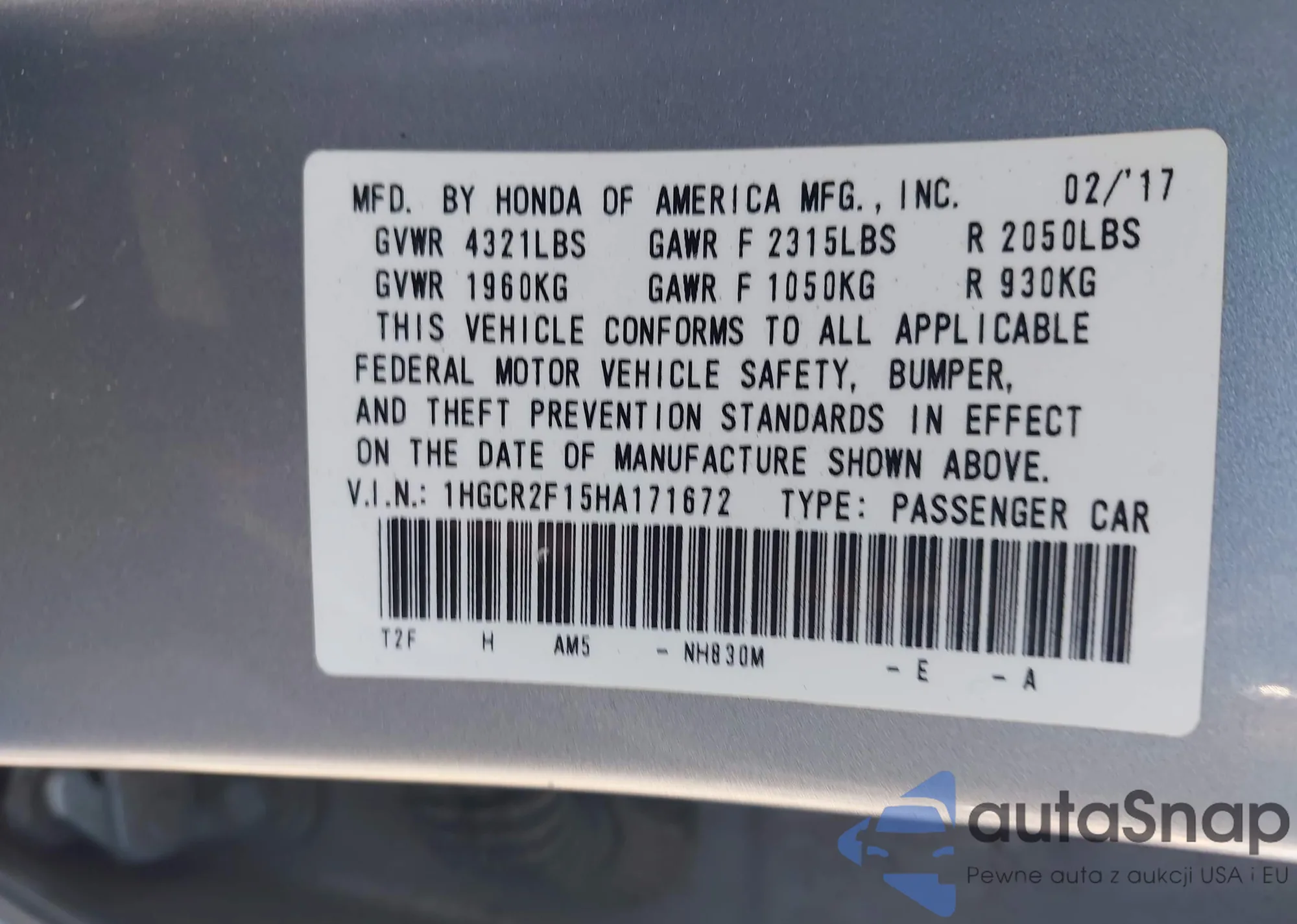 • VIN 1HGCR2F15HA171672