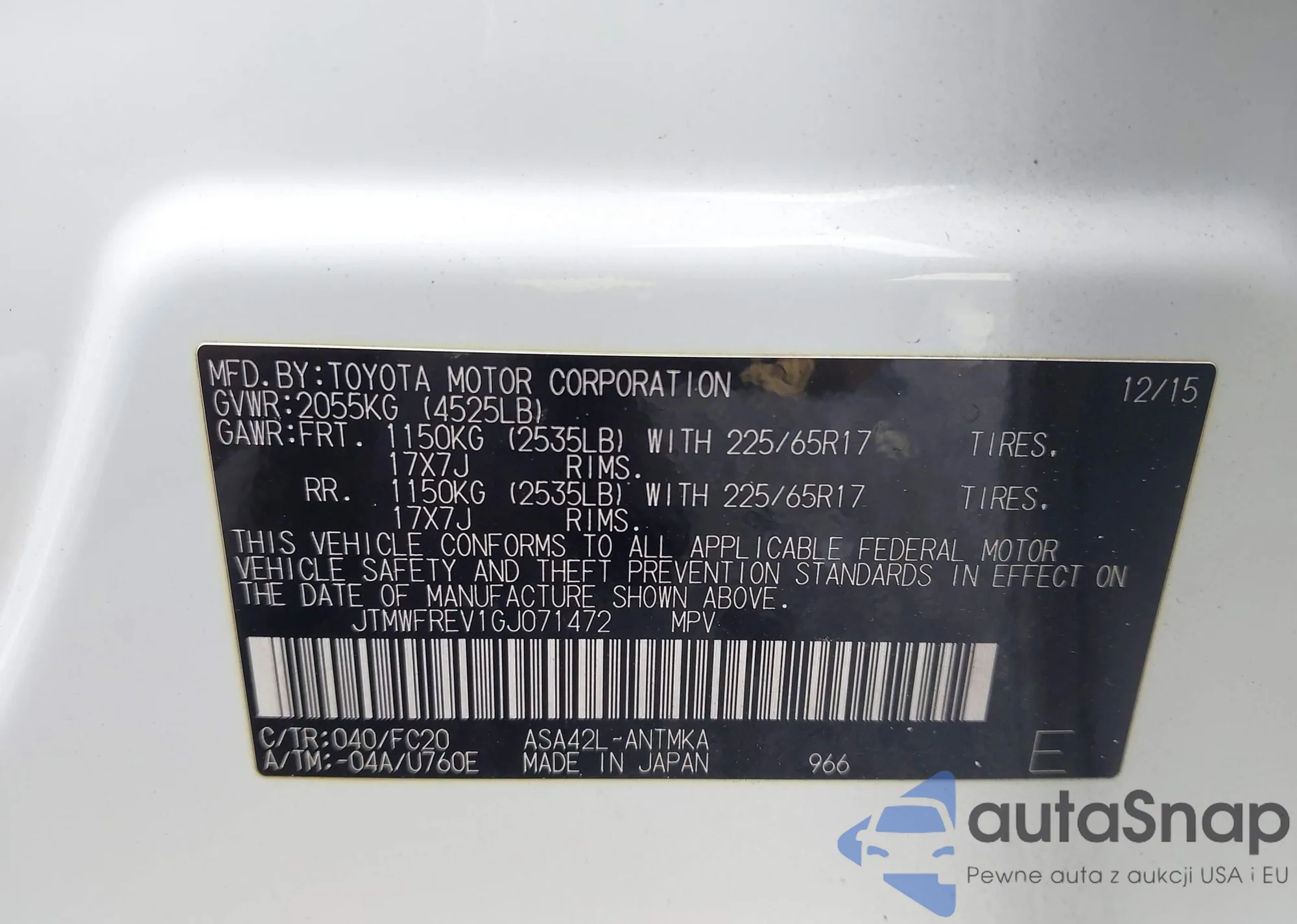 LOT: 43376528 VIN: JTMWFREV1GJ071472
