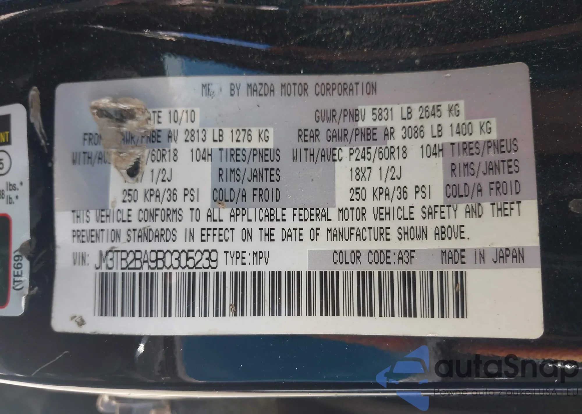 LOT: 43520058 VIN: 1HGCV3F50MA016011