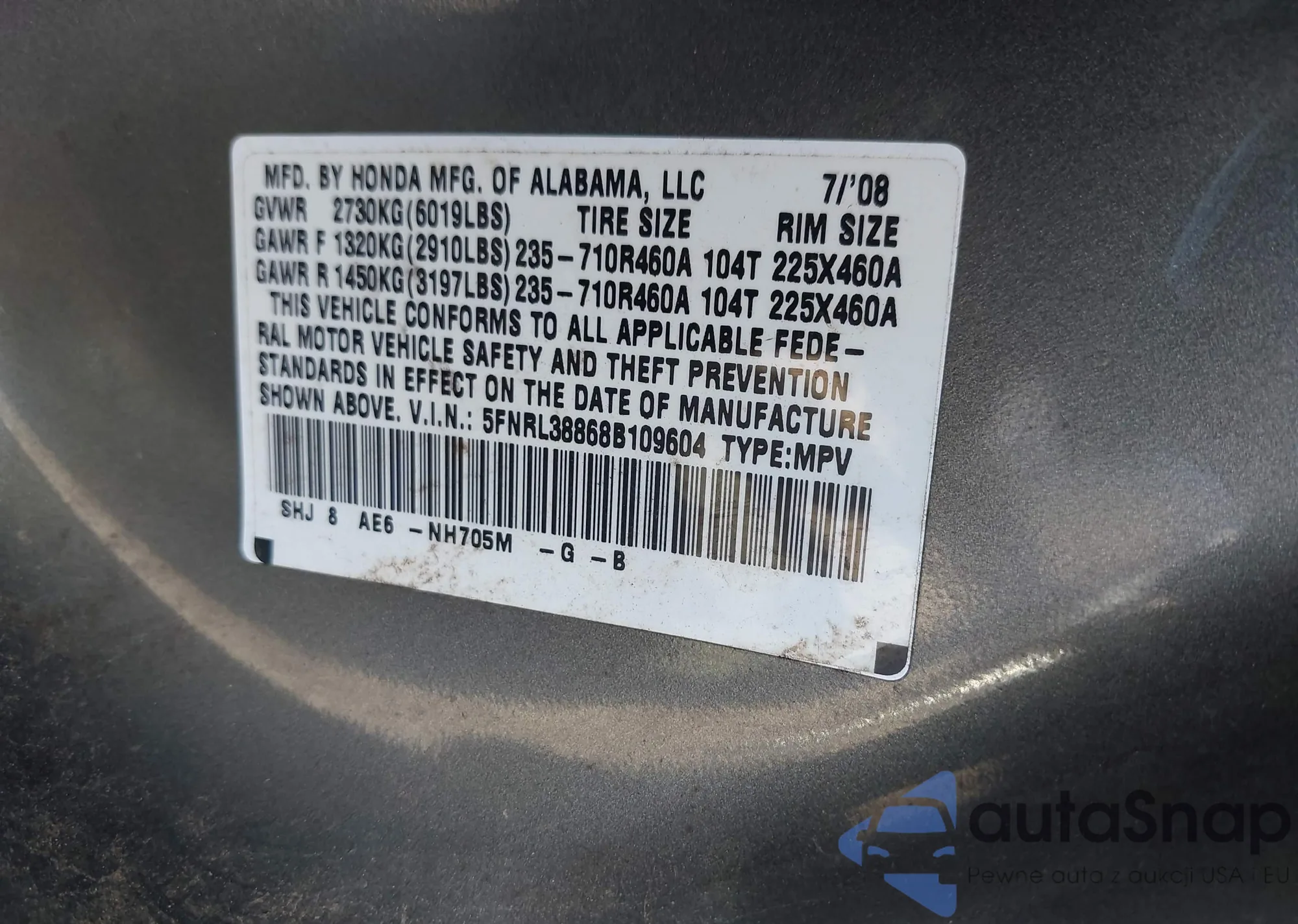 • VIN 5FNRL38868B109604