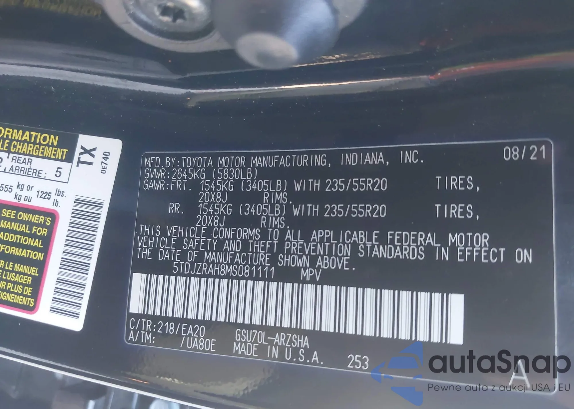 LOT: 43587673 VIN: 5TDJZRAH8MS081111