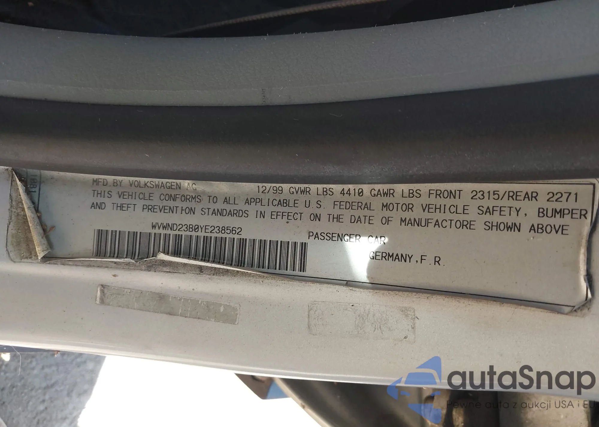 LOT: 43612653 VIN: WVWND23B0YE238562
