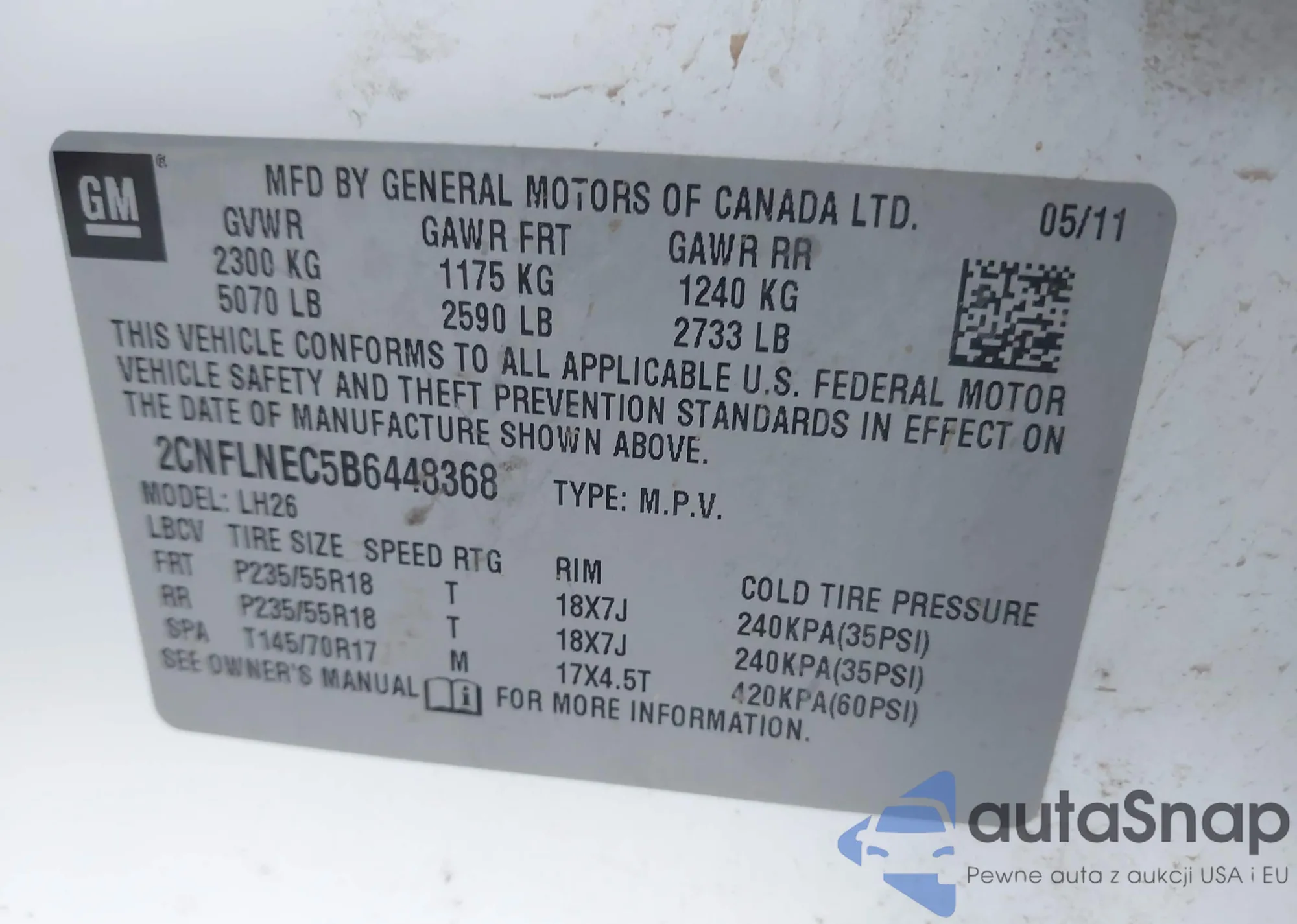 LOT: 43312540 VIN: 2CNFLNEC5B6448368