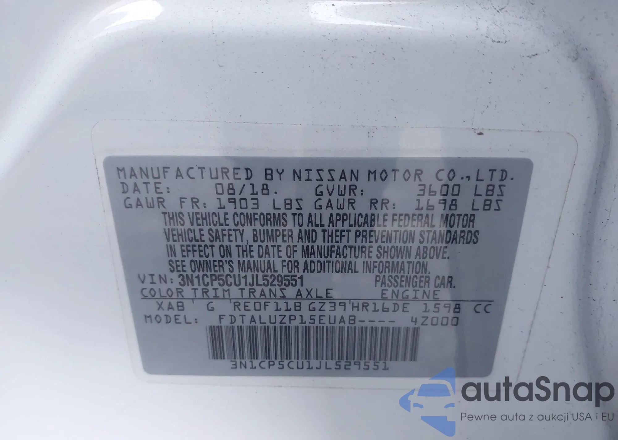 LOT: 43343884 VIN: 3N1CP5CU1JL529551