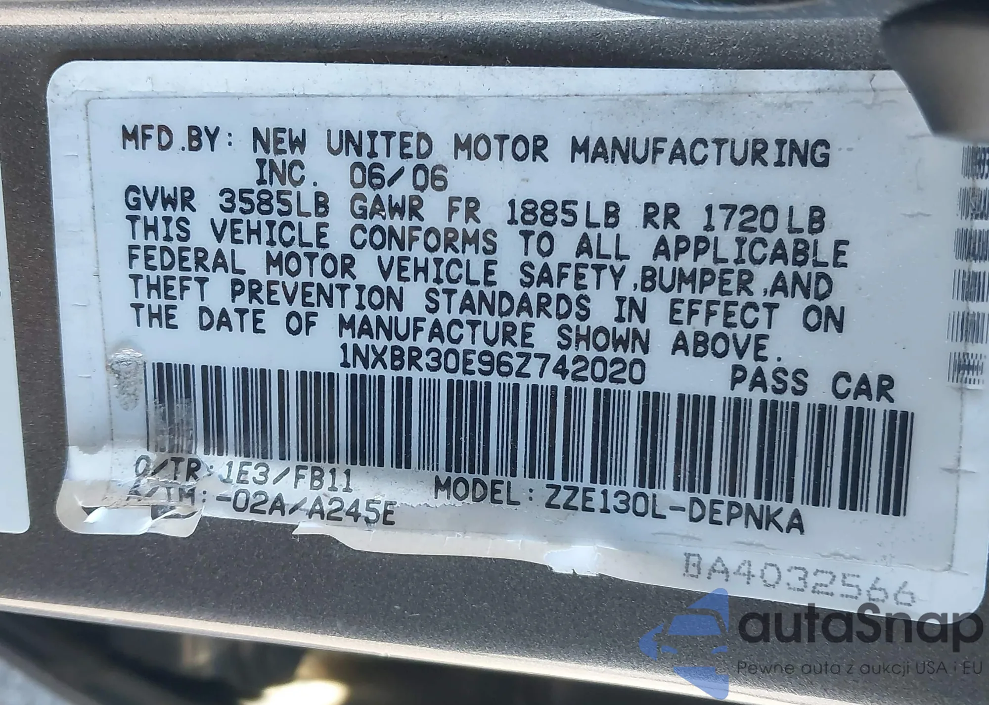 LOT: 43467282 VIN: 1NXBR30E96Z742020