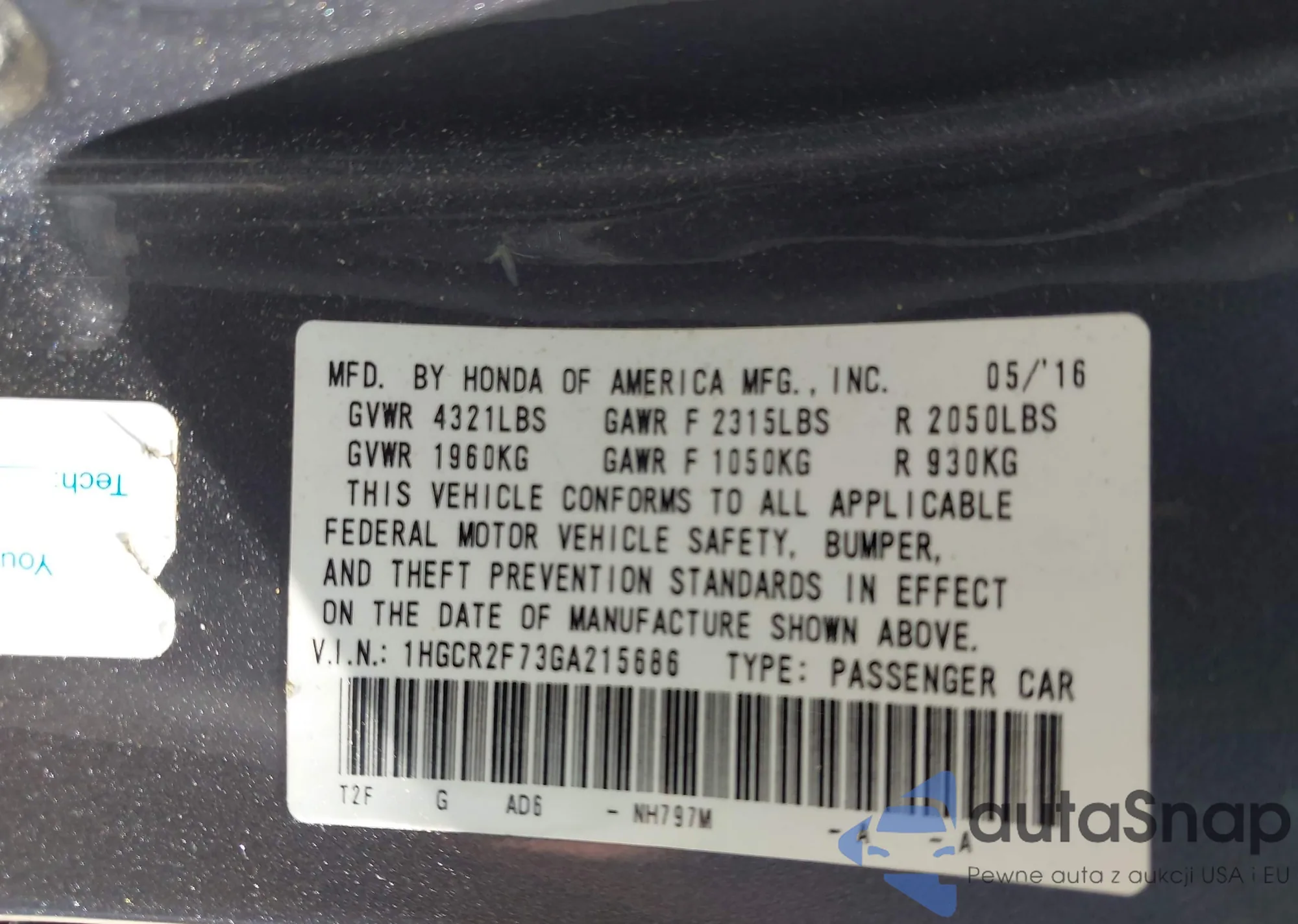 LOT: 43258278 VIN: 1HGCR2F73GA215686