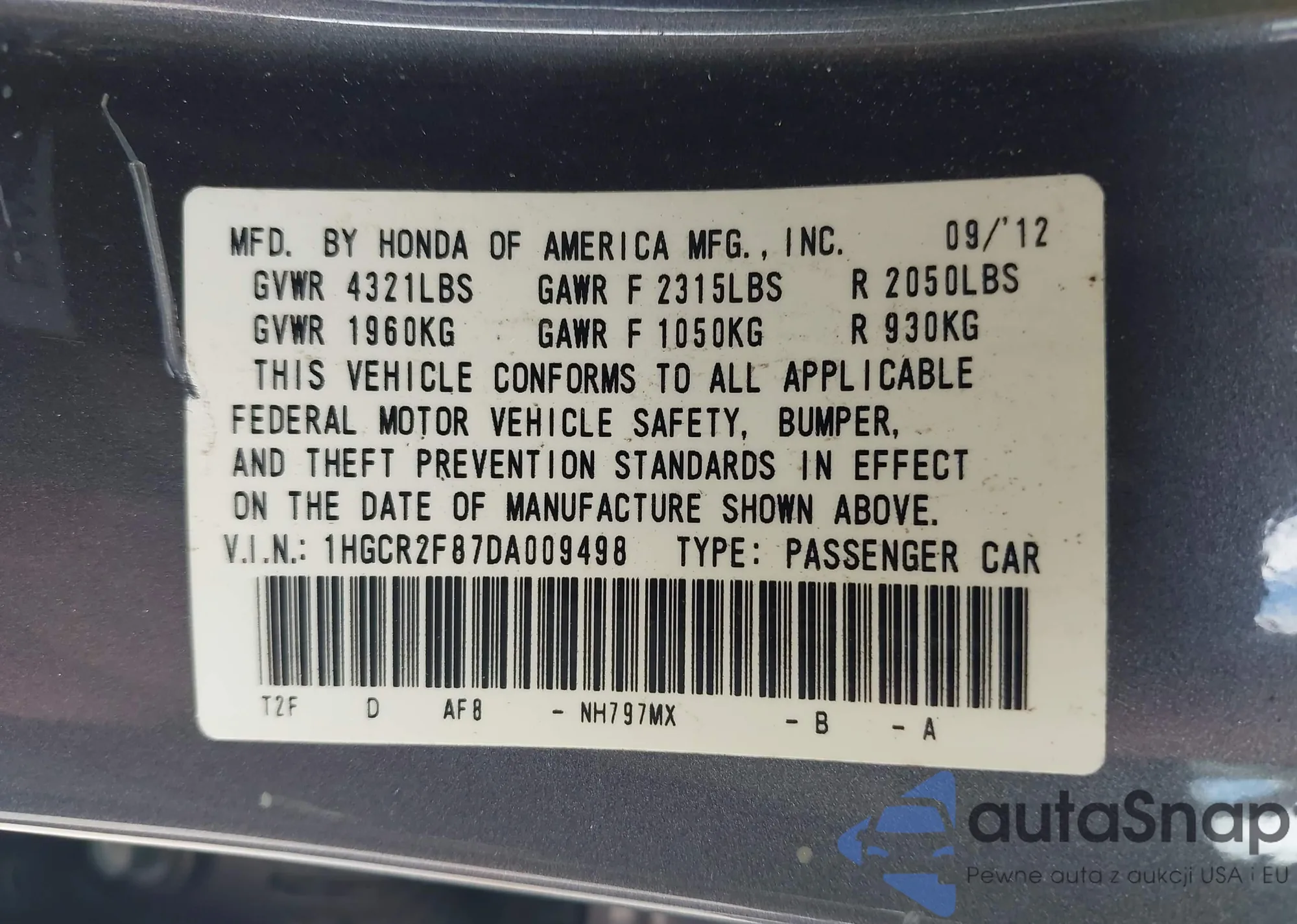 • VIN 1HGCR2F87DA009498
