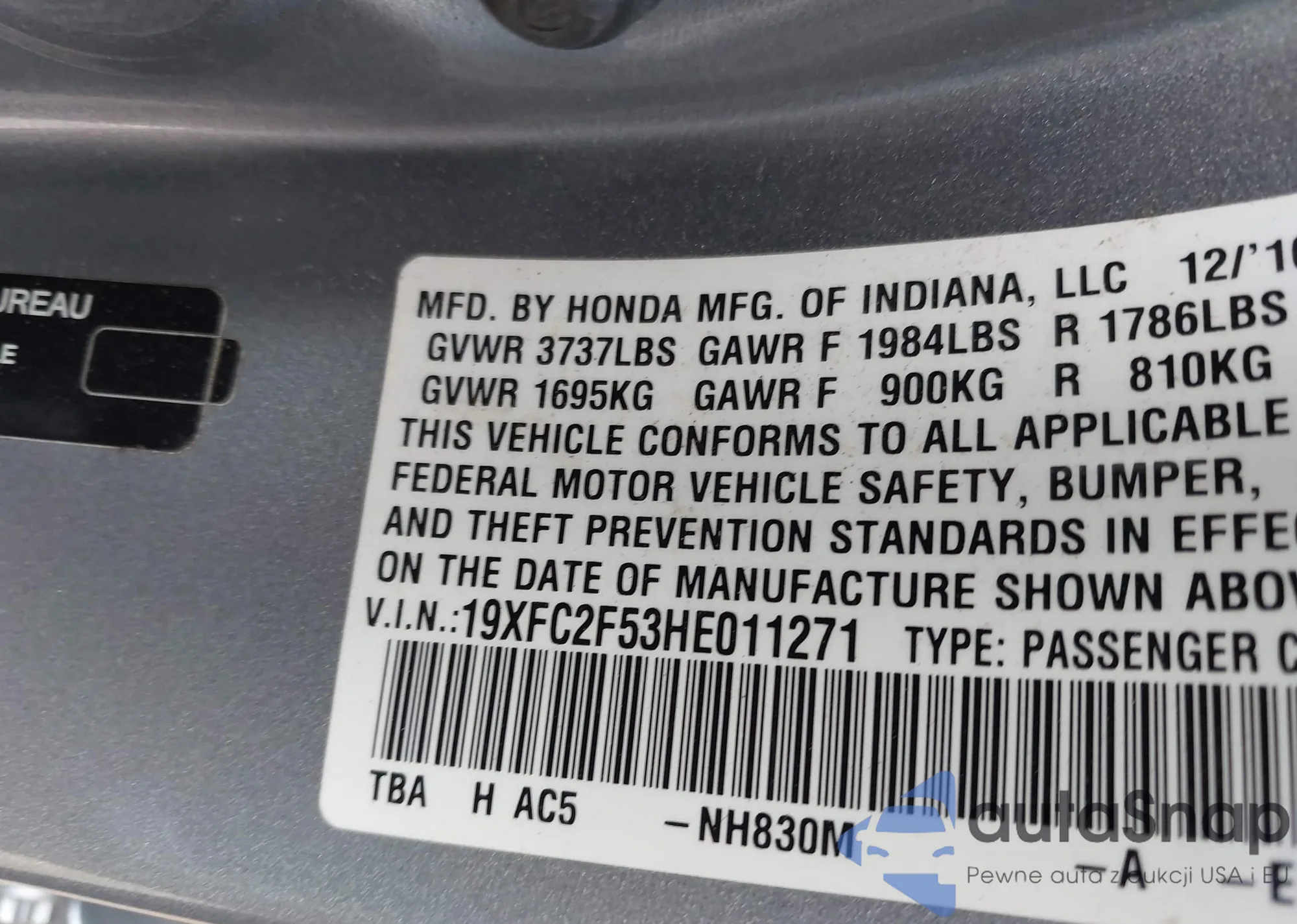 • VIN 19XFC2F53HE011271