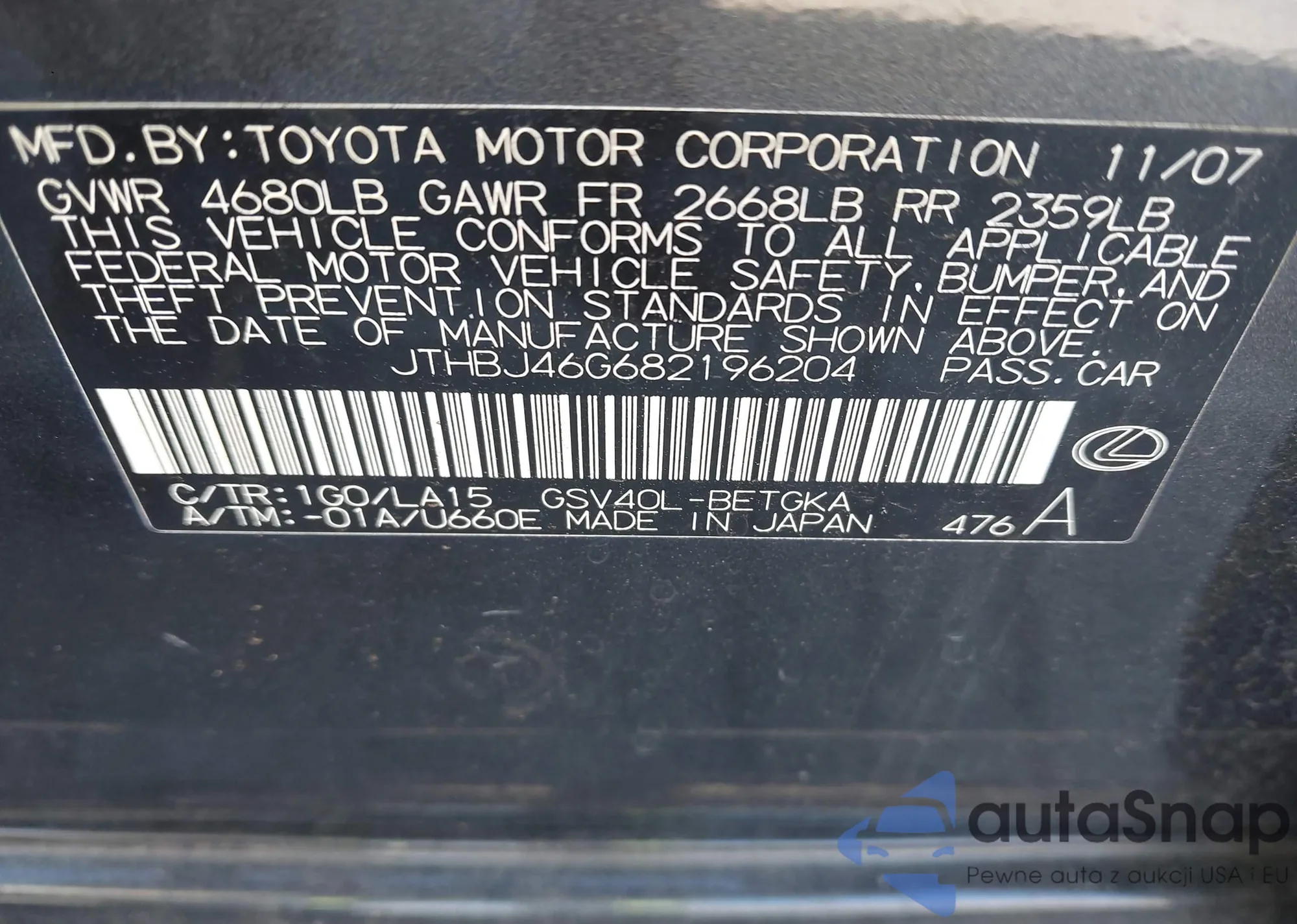 LOT: 43438811 VIN: JTHBJ46G682196204